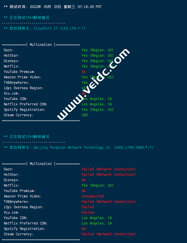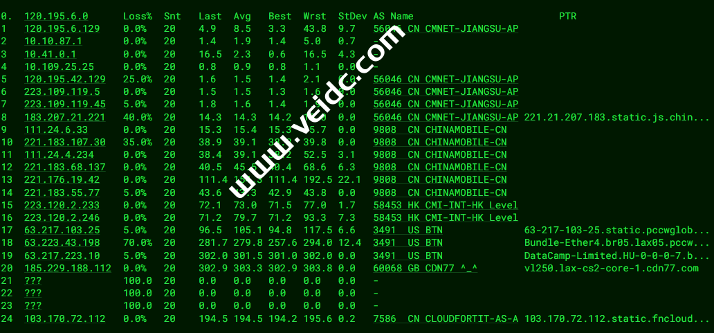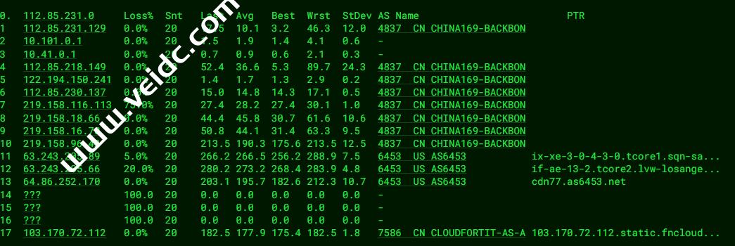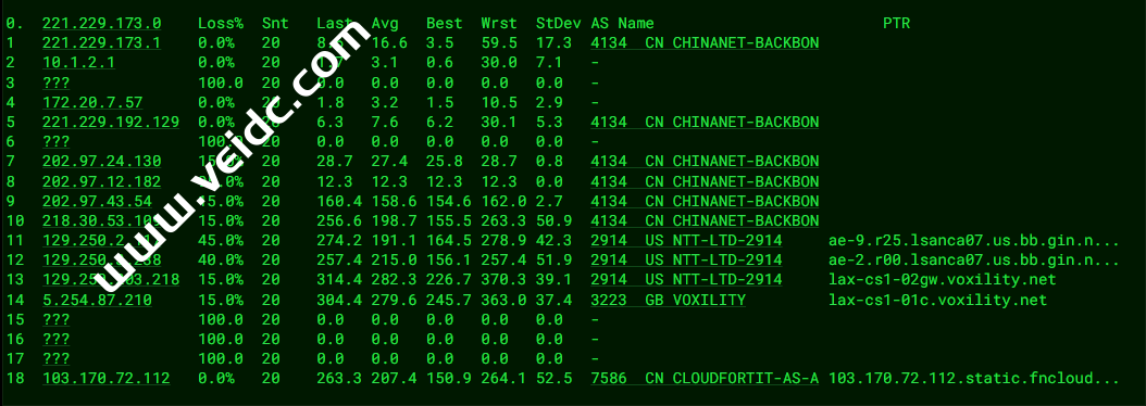 [Info] 测试路由 到 上海电信(天翼云) 中 ... traceroute to 101.227.255.45 (101.227.255.45), 30 hops max, 32 byte packets 1 * 2 * 3 100.64.10.10 0.80 ms * 共享地址 4 * 5 * 6 219.158.97.177 170.39 ms AS4837 中国, 上海, chinaunicom.com, 联通 7 219.158.6.205 174.00 ms AS4837 中国, 上海, chinaunicom.com, 联通 8 219.158.8.245 176.54 ms AS4837 中国, 上海, chinaunicom.com, 联通 9 * 10 * 11 * 12 61.152.25.169 304.81 ms AS4812 中国, 上海, chinatelecom.com.cn, 电信 13 * 14 * 15 * 16 * 17 * 18 * 19 * 20 * 21 * 22 * 23 * 24 * 25 * 26 * 27 * 28 * 29 * 30 * [Info] 测试路由 到 上海电信(天翼云) 完成 ! [Info] 测试路由 到 厦门电信CN2 中 ... traceroute to 117.28.254.129 (117.28.254.129), 30 hops max, 32 byte packets 1 * 2 * 3 lax-cs1-01c.voxility.net (5.254.87.241) 0.65 ms AS3223 美国, 加利福尼亚州, 洛杉矶, voxility.com 4 ae79.edge7.LosAngeles1.Level3.net (4.28.145.53) 0.80 ms AS3356 美国, 加利福尼亚州, 洛杉矶, level3.com 5 ae2.3602.ear2.LosAngeles1.level3.net (4.69.207.45) 0.76 ms AS3356 美国, 加利福尼亚州, 洛杉矶, level3.com 6 CHINA-TELEC.ear2.LosAngeles1.Level3.net (4.71.136.202) 2.52 ms AS3356 美国, 加利福尼亚州, 洛杉矶, level3.com 7 59.43.182.89 130.44 ms * 中国, 上海, chinatelecom.com.cn, 电信 8 * 9 59.43.138.53 132.61 ms * 中国, 上海, chinatelecom.com.cn, 电信 10 59.43.138.186 154.51 ms * 中国, 福建, chinatelecom.com.cn, 电信 11 * 12 * 13 117.25.141.106 261.56 ms AS133775 中国, 福建, 厦门, chinatelecom.com.cn, 电信 14 117.28.254.129 154.97 ms AS4809 中国, 福建, 厦门, chinatelecom.com.cn, 电信 [Info] 测试路由 到 厦门电信CN2 完成 ! [Info] 测试路由 到 浙江杭州联通 中 ... traceroute to 101.71.241.238 (101.71.241.238), 30 hops max, 32 byte packets 1 * 2 * 3 100.64.10.10 0.79 ms * 共享地址 4 * 5 * 6 219.158.6.5 249.86 ms AS4837 中国, 上海, chinaunicom.com, 联通 7 219.158.19.74 181.53 ms AS4837 中国, 上海, chinaunicom.com, 联通 8 219.158.19.81 181.22 ms AS4837 中国, 上海, chinaunicom.com, 联通 9 * 10 * 11 * 12 * 13 * 14 * 15 * 16 * 17 * 18 * 19 * 20 * 21 * 22 * 23 * 24 * 25 * 26 * 27 * 28 * 29 * 30 * [Info] 测试路由 到 浙江杭州联通 完成 ! [Info] 测试路由 到 浙江杭州移动 中 ... traceroute to 112.17.0.106 (112.17.0.106), 30 hops max, 32 byte packets 1 * 2 * 3 100.64.10.10 1.00 ms * 共享地址 4 * 5 * 6 219.158.6.5 245.91 ms AS4837 中国, 上海, chinaunicom.com, 联通 7 219.158.6.209 190.70 ms AS4837 中国, 上海, chinaunicom.com, 联通 8 219.158.7.129 206.16 ms AS4837 中国, 上海, chinaunicom.com, 联通 9 219.158.106.94 189.40 ms AS4837 中国, 浙江, 杭州, chinaunicom.com, 联通 10 * 11 * 12 221.183.95.121 166.42 ms AS9808 中国, 浙江, 杭州, chinamobile.com, 移动 13 * 14 * 15 * 16 * 17 * 18 * 19 * 20 * 21 * 22 * 23 * 24 * 25 * 26 * 27 * 28 * 29 * 30 * [Info] 测试路由 到 浙江杭州移动 完成 ! [Info] 测试路由 到 北京教育网 中 ... traceroute to 202.205.6.30 (202.205.6.30), 30 hops max, 32 byte packets 1 * 2 * 3 100.64.10.10 2.04 ms * 共享地址 4 * 5 * 6 219.158.116.249 179.65 ms AS4837 中国, 上海, chinaunicom.com, 联通 7 219.158.8.177 278.11 ms AS4837 中国, 上海, chinaunicom.com, 联通 8 * 9 219.158.9.98 158.33 ms AS4837 中国, 上海, chinaunicom.com, 联通 10 219.158.44.86 186.01 ms AS4837 柬埔寨, chinaunicom.com, 联通 11 101.4.118.41 221.81 ms AS4538 中国, 甘肃, 兰州, edu.cn, 教育网 12 101.4.118.197 226.77 ms AS4538 中国, 北京, edu.cn, 教育网 13 101.4.113.110 188.08 ms AS4538 中国, 北京, edu.cn, 教育网 14 219.224.102.230 173.80 ms AS4538 中国, 北京, edu.cn, 教育网 15 * 16 * 17 * 18 * 19 * 20 * 21 101.4.130.54 223.12 ms AS4538 中国, 北京, edu.cn, 教育网 22 * 23 * 24 * 25 * 26 * 27 * 28 * 29 * 30 * [Info] 测试路由 到 北京教育网 完成 ! [Info] 四网路由快速测试 已完成 !