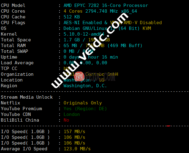 CPU:AMD EPYC 7282,主频2794.748 MHz,磁盘IO: 123.0 MB/s,如果嫌低,可以发工单要求解锁磁盘IO。