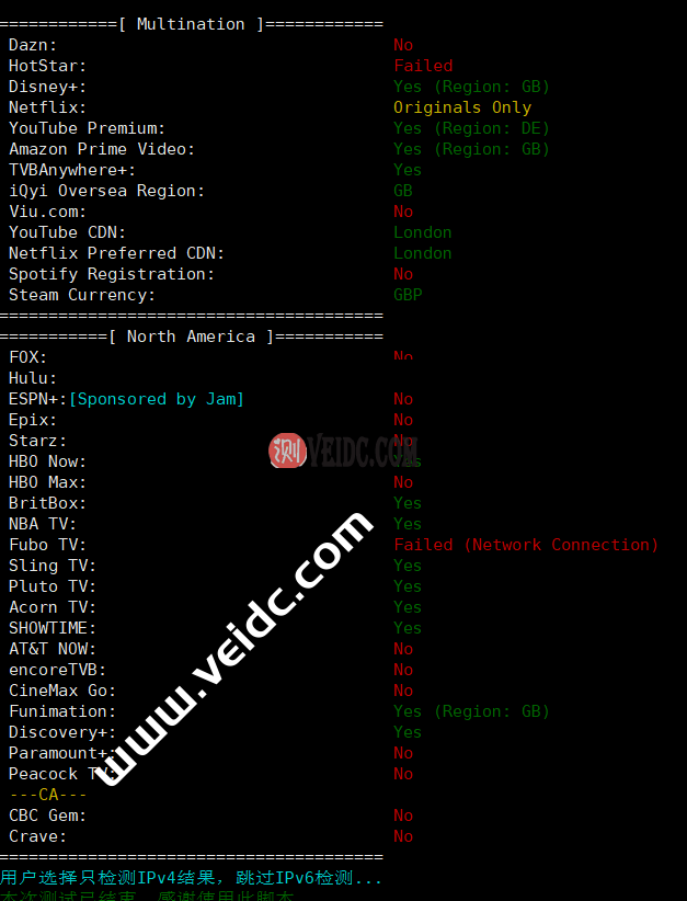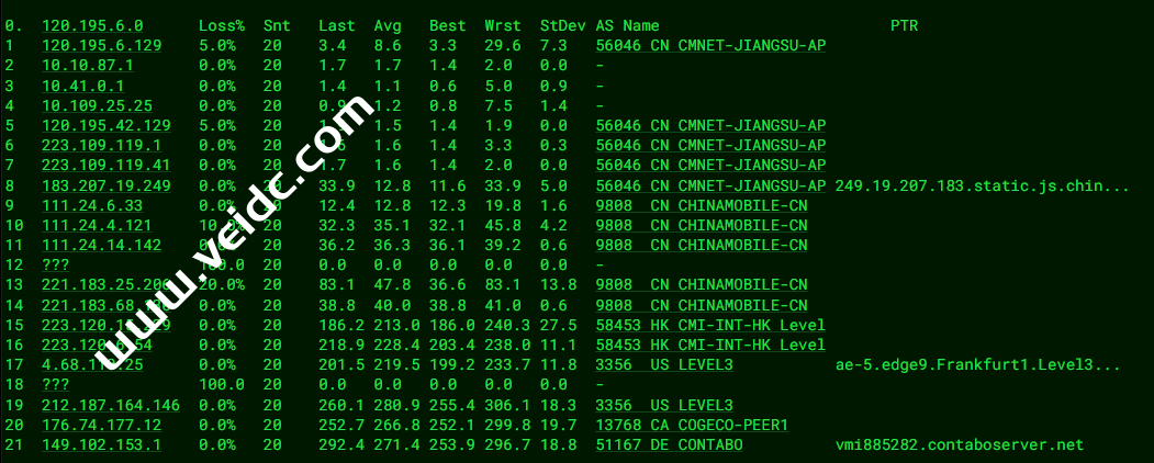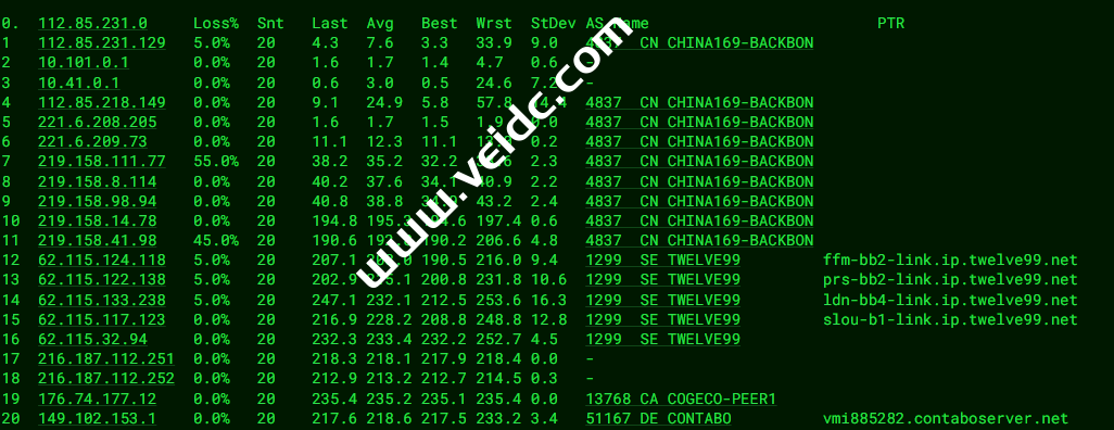 Traceroute to China, Guangzhou CU (TCP Mode, Max 30 Hop) ============================================================ traceroute to 210.21.4.130 (210.21.4.130), 30 hops max, 32 byte packets 1 45.141.122.11 0.51 ms AS51167 United Kingdom, Hampshire County, Portsmouth, ki-services.de 2 176.74.177.10 0.44 ms AS13768 United Kingdom, Hampshire County, Portsmouth, aptum.com 3 216.187.112.248 4.04 ms * United Kingdom, London, aptum.com 4 216.187.112.248 3.62 ms * United Kingdom, London, aptum.com 5 130.117.51.137 4.25 ms AS174 United Kingdom, London, cogentco.com 6 130.117.51.137 4.20 ms AS174 United Kingdom, London, cogentco.com 7 130.117.51.42 11.24 ms AS174 Netherlands, North Holland, Amsterdam, cogentco.com 8 154.54.37.30 18.61 ms AS174 Germany, Hesse, Frankfurt, cogentco.com 9 154.54.56.190 18.65 ms AS174 Germany, Hesse, Frankfurt, cogentco.com 10 130.117.0.30 18.04 ms AS174 Europe Regions, cogentco.com 11 * 12 219.158.11.181 193.25 ms AS4837 China, Guangdong, Guangzhou, ChinaUnicom 13 219.158.14.29 188.01 ms AS4837 China, Guangdong, Guangzhou, ChinaUnicom 14 219.158.8.113 209.40 ms AS4837 China, Guangdong, Guangzhou, ChinaUnicom 15 112.91.0.254 190.59 ms AS17816 China, Guangdong, Guangzhou, ChinaUnicom 16 112.91.0.254 179.84 ms AS17816 China, Guangdong, Guangzhou, ChinaUnicom 17 * 18 * 19 * 20 * 21 * 22 * 23 * 24 * 25 * 26 * 27 * 28 * 29 * 30 * Traceroute to China, Shanghai CU (TCP Mode, Max 30 Hop) ============================================================ traceroute to 58.247.8.158 (58.247.8.158), 30 hops max, 32 byte packets 1 45.141.122.12 0.85 ms AS51167 United Kingdom, Hampshire County, Portsmouth, ki-services.de 2 10.0.50.1 1.36 ms * LAN Address 3 216.187.112.248 3.65 ms * United Kingdom, London, aptum.com 4 216.187.112.248 3.82 ms * United Kingdom, London, aptum.com 5 149.14.226.145 5.27 ms AS174 United Kingdom, London, cogentco.com 6 154.54.56.94 11.64 ms AS174 Netherlands, North Holland, Amsterdam, cogentco.com 7 130.117.0.142 18.32 ms AS174 Germany, Hesse, Frankfurt, cogentco.com 8 130.117.0.142 18.03 ms AS174 Germany, Hesse, Frankfurt, cogentco.com 9 130.117.0.30 18.34 ms AS174 Europe Regions, cogentco.com 10 154.25.14.78 18.31 ms AS174 Europe Regions, cogentco.com 11 154.25.14.78 18.31 ms AS174 Europe Regions, cogentco.com 12 * 13 219.158.115.125 202.71 ms AS4837 China, Shanghai, ChinaUnicom 14 219.158.115.125 199.75 ms AS4837 China, Shanghai, ChinaUnicom 15 219.158.8.177 201.43 ms AS4837 China, Shanghai, ChinaUnicom 16 * 17 * 18 139.226.225.22 209.01 ms AS17621 China, Shanghai, ChinaUnicom 19 58.247.8.153 228.30 ms AS17621 China, Shanghai, ChinaUnicom 20 58.247.8.153 215.67 ms AS17621 China, Shanghai, ChinaUnicom 21 * 22 * 23 * 24 * 25 * 26 * 27 * 28 * 29 * 30 * Traceroute to China, Beijing CU (TCP Mode, Max 30 Hop) ============================================================ traceroute to 123.125.99.1 (123.125.99.1), 30 hops max, 32 byte packets 1 45.141.122.11 9.50 ms AS51167 United Kingdom, Hampshire County, Portsmouth, ki-services.de 2 10.0.50.1 7.57 ms * LAN Address 3 216.187.112.248 9.29 ms * United Kingdom, London, aptum.com 4 149.14.226.145 4.17 ms AS174 United Kingdom, London, cogentco.com 5 130.117.51.137 18.38 ms AS174 United Kingdom, London, cogentco.com 6 154.54.56.94 11.48 ms AS174 Netherlands, North Holland, Amsterdam, cogentco.com 7 130.117.0.142 18.14 ms AS174 Germany, Hesse, Frankfurt, cogentco.com 8 130.117.0.2 18.34 ms AS174 Germany, Hesse, Frankfurt, cogentco.com 9 130.117.1.117 17.92 ms AS174 Germany, Hesse, Frankfurt, cogentco.com 10 149.11.181.18 46.22 ms AS174 Germany, Hesse, Frankfurt, cogentco.com 11 219.158.21.109 200.90 ms AS4837 China, Beijing, ChinaUnicom 12 219.158.3.145 221.21 ms AS4837 China, Beijing, ChinaUnicom 13 * 14 221.219.202.250 233.98 ms AS4808 China, Beijing, ChinaUnicom 15 124.65.194.138 205.29 ms AS4808 China, Beijing, ChinaUnicom 16 61.148.158.106 211.88 ms AS4808 China, Beijing, ChinaUnicom 17 61.135.113.154 199.76 ms AS4808 China, Beijing, ChinaUnicom 18 123.125.99.1 238.70 ms AS4808 China, Beijing, ChinaUnicom
