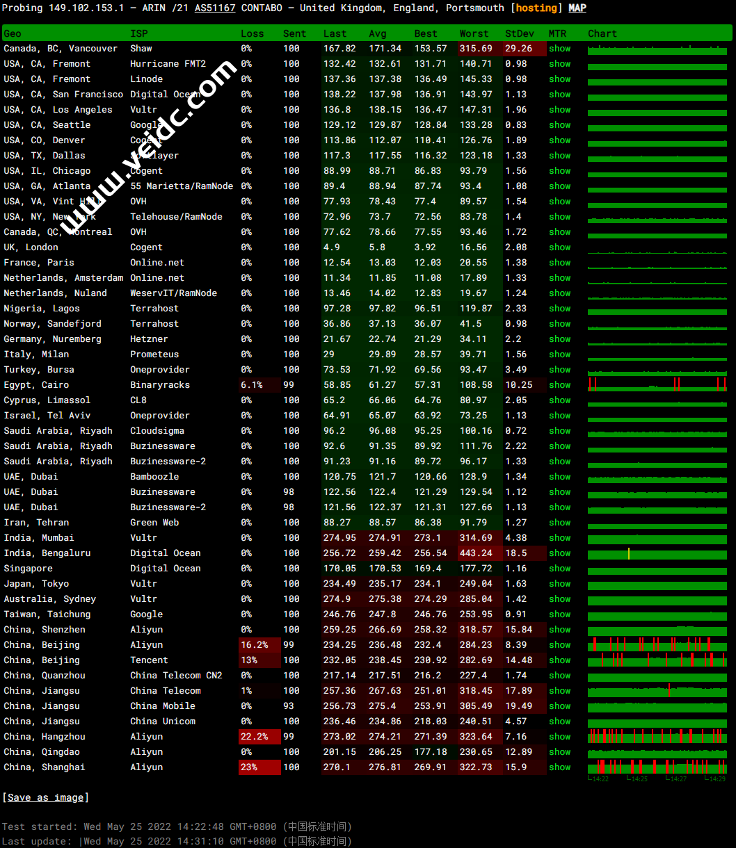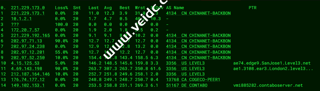 Traceroute to China, Guangzhou CT (TCP Mode, Max 30 Hop) ============================================================ traceroute to 113.108.209.1 (113.108.209.1), 30 hops max, 32 byte packets 1 45.141.122.12 12.89 ms AS51167 United Kingdom, Hampshire County, Portsmouth, ki-services.de 2 176.74.177.10 14.19 ms AS13768 United Kingdom, Hampshire County, Portsmouth, aptum.com 3 176.74.177.10 12.60 ms AS13768 United Kingdom, Hampshire County, Portsmouth, aptum.com 4 149.14.226.145 12.13 ms AS174 United Kingdom, London, cogentco.com 5 130.117.51.137 12.83 ms AS174 United Kingdom, London, cogentco.com 6 154.54.61.162 12.31 ms AS174 United Kingdom, London, cogentco.com 7 154.54.61.162 12.34 ms AS174 United Kingdom, London, cogentco.com 8 202.97.13.21 315.95 ms AS4134 China, Guangdong, Guangzhou, ChinaTelecom 9 202.97.13.21 308.18 ms AS4134 China, Guangdong, Guangzhou, ChinaTelecom 10 202.97.82.61 316.84 ms AS4134 China, Guangdong, Guangzhou, ChinaTelecom 11 202.97.82.61 307.60 ms AS4134 China, Guangdong, Guangzhou, ChinaTelecom 12 * 13 113.108.209.1 308.74 ms AS4134 China, Guangdong, Guangzhou, ChinaTelecom Traceroute to China, Shanghai CT (TCP Mode, Max 30 Hop) ============================================================ traceroute to 180.153.28.5 (180.153.28.5), 30 hops max, 32 byte packets 1 45.141.122.11 2.47 ms AS51167 United Kingdom, Hampshire County, Portsmouth, ki-services.de 2 10.0.50.1 2.66 ms * LAN Address 3 176.74.177.10 5.49 ms AS13768 United Kingdom, Hampshire County, Portsmouth, aptum.com 4 149.14.226.145 4.86 ms AS174 United Kingdom, London, cogentco.com 5 149.14.226.145 13.65 ms AS174 United Kingdom, London, cogentco.com 6 130.117.51.137 4.62 ms AS174 United Kingdom, London, cogentco.com 7 154.54.61.162 4.94 ms AS174 United Kingdom, London, cogentco.com 8 * 9 * 10 * 11 101.95.88.65 317.26 ms AS4812 China, Shanghai, ChinaTelecom 12 * 13 * 14 101.227.255.34 316.80 ms AS4812 China, Shanghai, ChinaTelecom 15 * 16 180.153.28.5 320.71 ms AS4812 China, Shanghai, ChinaTelecom Traceroute to China, Beijing CT (TCP Mode, Max 30 Hop) ============================================================ traceroute to 180.149.128.9 (180.149.128.9), 30 hops max, 32 byte packets 1 45.141.122.12 8.06 ms AS51167 United Kingdom, Hampshire County, Portsmouth, ki-services.de 2 176.74.177.10 8.72 ms AS13768 United Kingdom, Hampshire County, Portsmouth, aptum.com 3 176.74.177.10 9.81 ms AS13768 United Kingdom, Hampshire County, Portsmouth, aptum.com 4 216.187.112.248 11.12 ms * United Kingdom, London, aptum.com 5 130.117.51.137 13.11 ms AS174 United Kingdom, London, cogentco.com 6 130.117.51.137 6.93 ms AS174 United Kingdom, London, cogentco.com 7 149.14.81.226 57.22 ms AS174 United Kingdom, London, cogentco.com 8 149.14.81.226 60.07 ms AS174 United Kingdom, London, cogentco.com 9 * 10 202.97.14.237 275.57 ms AS4134 China, Beijing, ChinaTelecom 11 * 12 * 13 * 14 * 15 *