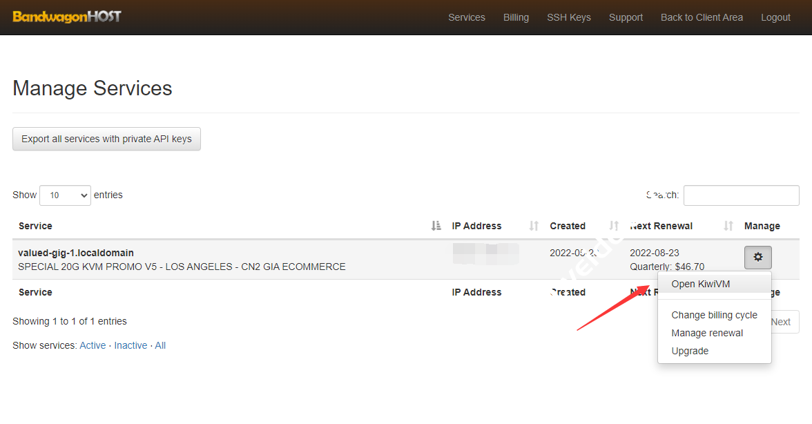 进入My Services(我的服务)页面,该页面搬瓦工重构过,所以和常见的WHMCS页面是不一样的,在这里可以看到购买的VPS信息,点击Open KiwiVM(打开KiwiVM),直达KiwiVM面板。