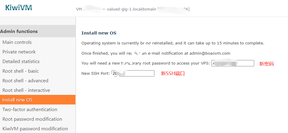 大概几分钟就好了,上面是新的密码和SSH端口。系统也会发送最新的信息到邮件,通过KiwiVM面板重装系统教程就这样简单,如果有任何问题可以联系老杨咨询。