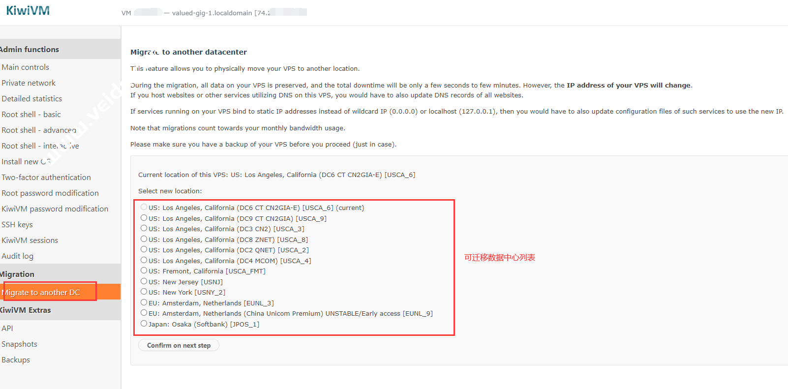 进入KiwiVM面板后,点击Migrate to another DC(迁移到其他数据中心)