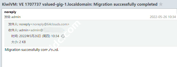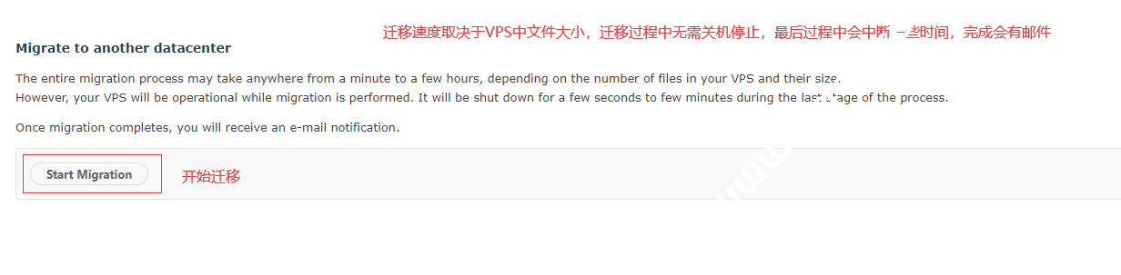 点击Start Migration(开始迁移),下面英文大意为:整个迁移过程可能需要一分钟到几个小时,具体取决于VPS中的文件数量及其大小。但是,在执行迁移时,您的VPS将可以运行。在流程的最后阶段,它将关闭几秒钟到几分钟。迁移完成后,您将收到一封电子邮件通知。