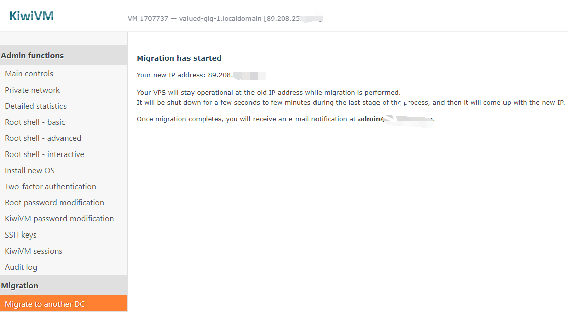 确认迁移后将看到新的IP地址并收到一封邮件