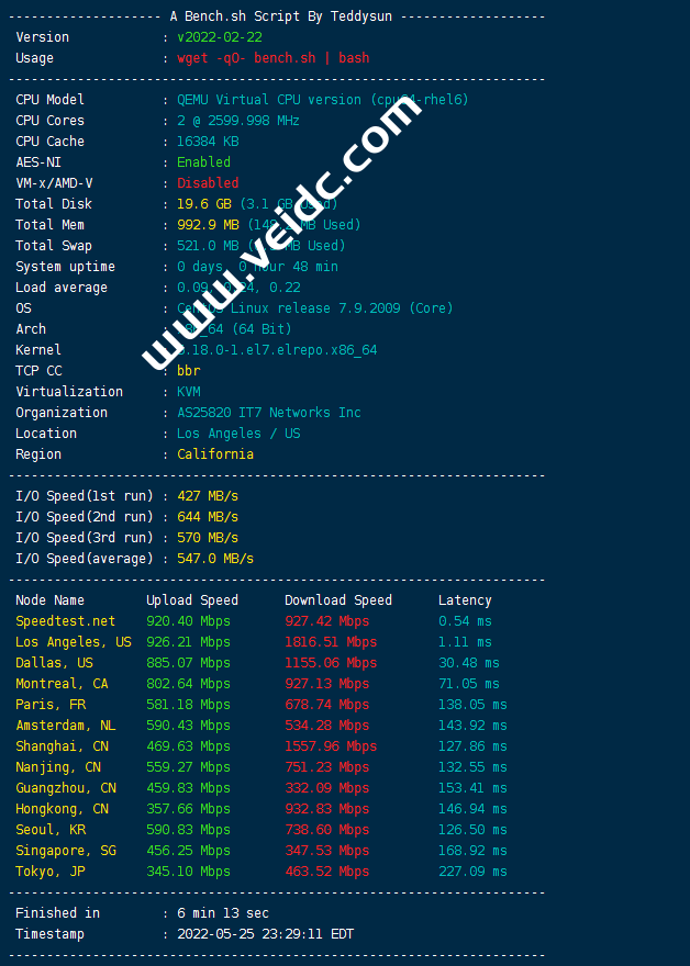 近期我们将对搬瓦工12个热门机房进行全面测评,本次测评机房为美国洛杉矶(DC9 CT CN2GIA) [USCA_9],本次测评机器为2核1G20GBSSD,2.5Gbps/1TB流量,也就是下表红色价格季付$49.99的这个经典款。下面就来看看最新的测评数据分享。