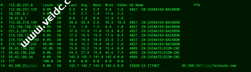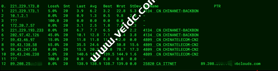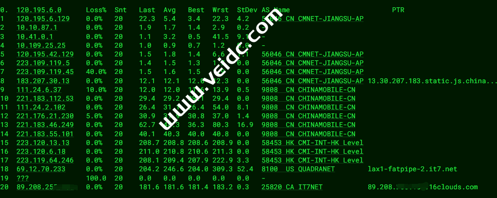 [Info] 测试路由 到 上海电信(天翼云) 中 ... traceroute to 101.227.255.45 (101.227.255.45), 30 hops max, 32 byte packets 1 * 2 218.30.48.61 0.81 ms AS4134 美国, 加利福尼亚州, 洛杉矶, chinatelecom.com.cn, 电信 3 59.43.182.89 161.49 ms * 中国, 上海, chinatelecom.com.cn, 电信 4 * 5 59.43.130.217 131.38 ms * 中国, 上海, chinatelecom.com.cn, 电信 6 101.95.88.174 132.03 ms AS4812 中国, 上海, chinatelecom.com.cn, 电信 7 101.95.206.26 132.37 ms AS4812 中国, 上海, chinatelecom.com.cn, 电信 8 * 9 * 10 * 11 * 12 * 13 * 14 * 15 * 16 * 17 * 18 * 19 * 20 * 21 * 22 * 23 * 24 * 25 * 26 * 27 * 28 * 29 * 30 * [Info] 测试路由 到 上海电信(天翼云) 完成 ! [Info] 测试路由 到 厦门电信CN2 中 ... traceroute to 117.28.254.129 (117.28.254.129), 30 hops max, 32 byte packets 1 * 2 218.30.48.61 0.64 ms AS4134 美国, 加利福尼亚州, 洛杉矶, chinatelecom.com.cn, 电信 3 59.43.184.157 126.75 ms * 中国, 上海, chinatelecom.com.cn, 电信 4 * 5 59.43.130.209 132.12 ms * 中国, 上海, chinatelecom.com.cn, 电信 6 59.43.138.186 150.54 ms * 中国, 福建, chinatelecom.com.cn, 电信 7 110.80.128.94 145.10 ms AS133775 中国, 福建, 厦门, chinatelecom.com.cn, 电信 8 * 9 117.25.141.106 146.00 ms AS133775 中国, 福建, 厦门, chinatelecom.com.cn, 电信 10 117.28.254.129 151.04 ms AS4809 中国, 福建, 厦门, chinatelecom.com.cn, 电信 [Info] 测试路由 到 厦门电信CN2 完成 ! [Info] 测试路由 到 浙江杭州联通 中 ... traceroute to 101.71.241.238 (101.71.241.238), 30 hops max, 32 byte packets 1 * 2 218.30.49.97 1.20 ms AS4134 美国, chinatelecom.com.cn, 电信 3 59.43.189.33 160.07 ms * 中国, 上海, chinatelecom.com.cn, 电信 4 * 5 59.43.138.61 128.26 ms * 中国, 上海, chinatelecom.com.cn, 电信 6 219.158.38.241 131.10 ms AS4837 中国, 上海, chinaunicom.com, 联通 7 219.158.113.197 129.39 ms AS4837 中国, 上海, chinaunicom.com, 联通 8 219.158.106.94 140.88 ms AS4837 中国, 浙江, 杭州, chinaunicom.com, 联通 9 101.71.244.94 133.55 ms AS4837 中国, 浙江, 杭州, chinaunicom.com, 联通 10 * 11 * 12 * 13 * 14 * 15 * 16 * 17 * 18 * 19 * 20 * 21 * 22 * 23 * 24 * 25 * 26 * 27 * 28 * 29 * 30 * [Info] 测试路由 到 浙江杭州联通 完成 ! [Info] 测试路由 到 浙江杭州移动 中 ... traceroute to 112.17.0.106 (112.17.0.106), 30 hops max, 32 byte packets 1 * 2 218.30.49.97 1.08 ms AS4134 美国, chinatelecom.com.cn, 电信 3 59.43.181.145 126.70 ms * 中国, 上海, chinatelecom.com.cn, 电信 4 * 5 59.43.138.53 129.44 ms * 中国, 上海, chinatelecom.com.cn, 电信 6 59.43.80.141 128.12 ms * 中国, 上海, chinatelecom.com.cn, 电信 7 * 8 * 9 * 10 221.183.94.137 165.29 ms AS9808 中国, 浙江, 杭州, chinamobile.com, 移动 11 * 12 * 13 * 14 * 15 * 16 * 17 * 18 * 19 * 20 * 21 * 22 * 23 * 24 * 25 * 26 * 27 * 28 * 29 * 30 * [Info] 测试路由 到 浙江杭州移动 完成 ! [Info] 测试路由 到 北京教育网 中 ... traceroute to 202.205.6.30 (202.205.6.30), 30 hops max, 32 byte packets 1 * 2 218.30.48.61 0.82 ms AS4134 美国, 加利福尼亚州, 洛杉矶, chinatelecom.com.cn, 电信 3 59.43.182.81 134.32 ms * 中国, 上海, chinatelecom.com.cn, 电信 4 * 5 59.43.138.45 134.61 ms * 中国, 上海, chinatelecom.com.cn, 电信 6 * 7 202.97.87.130 133.52 ms AS4134 中国, 上海, chinatelecom.com.cn, 电信 8 * 9 101.4.117.30 180.07 ms AS4538 中国, 北京, edu.cn, 教育网 10 101.4.116.118 184.74 ms AS4538 中国, 北京, edu.cn, 教育网 11 101.4.112.69 168.87 ms AS4538 中国, 北京, edu.cn, 教育网 12 101.4.113.110 178.06 ms AS4538 中国, 北京, edu.cn, 教育网 13 219.224.102.230 212.81 ms AS4538 中国, 北京, edu.cn, 教育网 14 * 15 * 16 * 17 * 18 101.4.130.54 169.30 ms AS4538 中国, 北京, edu.cn, 教育网 19 * 20 * 21 101.4.130.53 186.86 ms AS4538 中国, 北京, edu.cn, 教育网 22 * 23 * 24 * 25 101.4.130.53 193.60 ms AS4538 中国, 北京, edu.cn, 教育网 26 * 27 101.4.130.53 176.81 ms AS4538 中国, 北京, edu.cn, 教育网 28 * 29 101.4.130.53 197.98 ms AS4538 中国, 北京, edu.cn, 教育网 30 * [Info] 测试路由 到 北京教育网 完成 !