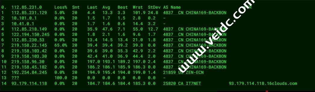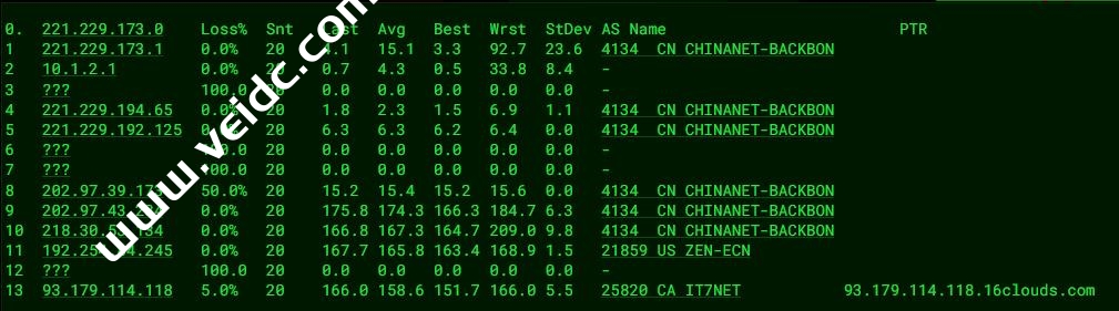 [Info] 测试路由 到 上海电信(天翼云) 中 ... traceroute to 101.227.255.45 (101.227.255.45), 30 hops max, 32 byte packets 1 * 2 te-2-0-6.cr2.lax2.us.zenlayer.net (192.254.81.134) 9.01 ms AS21859 美国, 加利福尼亚州, 洛杉矶, zenlayer.com 3 192.254.84.246 1.43 ms AS21859 美国, 加利福尼亚州, 洛杉矶, zenlayer.com 4 mx97-167.levelzipper.com (23.236.97.167) 0.66 ms AS21859 美国, 加利福尼亚州, 洛杉矶, zenlayer.com 5 218.30.53.133 2.26 ms AS4134 美国, 加利福尼亚州, 洛杉矶, chinatelecom.com.cn, 电信 6 * 7 202.97.12.209 150.03 ms AS4134 中国, 上海, chinatelecom.com.cn, 电信 8 202.97.57.158 151.29 ms AS4134 中国, 上海, chinatelecom.com.cn, 电信 9 * 10 * 11 * 12 * 13 * 14 * 15 * 16 * 17 * 18 * 19 * 20 * 21 * 22 * 23 * 24 * 25 * 26 * 27 * 28 * 29 * 30 * [Info] 测试路由 到 上海电信(天翼云) 完成 ! [Info] 测试路由 到 厦门电信CN2 中 ... traceroute to 117.28.254.129 (117.28.254.129), 30 hops max, 32 byte packets 1 * 2 te-2-0-6.cr2.lax2.us.zenlayer.net (192.254.81.134) 8.04 ms AS21859 美国, 加利福尼亚州, 洛杉矶, zenlayer.com 3 192.254.84.246 0.49 ms AS21859 美国, 加利福尼亚州, 洛杉矶, zenlayer.com 4 1-2-2.ear3.LosAngeles1.Level3.net (4.15.163.233) 1.29 ms AS3356 美国, 加利福尼亚州, 洛杉矶, level3.com 5 * 6 CHINA-TELEC.ear2.LosAngeles1.Level3.net (4.71.136.202) 3.15 ms AS3356 美国, 加利福尼亚州, 洛杉矶, level3.com 7 59.43.184.153 127.37 ms * 中国, 上海, chinatelecom.com.cn, 电信 8 * 9 59.43.138.49 144.19 ms * 中国, 上海, chinatelecom.com.cn, 电信 10 59.43.138.186 160.33 ms * 中国, 福建, chinatelecom.com.cn, 电信 11 * 12 27.159.81.210 162.55 ms AS133775 中国, 福建, 厦门, chinatelecom.com.cn, 电信 13 117.25.141.110 167.77 ms AS133775 中国, 福建, 厦门, chinatelecom.com.cn, 电信 14 117.28.254.129 171.22 ms AS4809 中国, 福建, 厦门, chinatelecom.com.cn, 电信 [Info] 测试路由 到 厦门电信CN2 完成 ! [Info] 测试路由 到 浙江杭州联通 中 ... traceroute to 101.71.241.238 (101.71.241.238), 30 hops max, 32 byte packets 1 * 2 te-2-0-6.cr2.lax2.us.zenlayer.net (192.254.81.134) 7.35 ms AS21859 美国, 加利福尼亚州, 洛杉矶, zenlayer.com 3 192.254.84.244 0.37 ms AS21859 美国, 加利福尼亚州, 洛杉矶, zenlayer.com 4 219.158.45.181 4.18 ms AS4837 美国, 加利福尼亚州, 洛杉矶, chinaunicom.com, 联通 5 219.158.96.33 157.92 ms AS4837 中国, 广东, 广州, chinaunicom.com, 联通 6 219.158.98.93 159.81 ms AS4837 中国, 广东, 广州, chinaunicom.com, 联通 7 219.158.8.113 149.45 ms AS4837 中国, 广东, 广州, chinaunicom.com, 联通 8 219.158.20.234 172.98 ms AS4837 中国, 浙江, 杭州, chinaunicom.com, 联通 9 101.71.244.94 172.33 ms AS4837 中国, 浙江, 杭州, chinaunicom.com, 联通 10 * 11 * 12 * 13 * 14 * 15 * 16 * 17 * 18 * 19 * 20 * 21 * 22 * 23 * 24 * 25 * 26 * 27 * 28 * 29 * 30 * [Info] 测试路由 到 浙江杭州联通 完成 ! [Info] 测试路由 到 浙江杭州移动 中 ... traceroute to 112.17.0.106 (112.17.0.106), 30 hops max, 32 byte packets 1 * 2 te-2-0-6.cr2.lax2.us.zenlayer.net (192.254.81.134) 7.13 ms AS21859 美国, 加利福尼亚州, 洛杉矶, zenlayer.com 3 192.254.84.246 0.71 ms AS21859 美国, 加利福尼亚州, 洛杉矶, zenlayer.com 4 223.119.66.113 8.13 ms AS58453 CHINAMOBILE.COM 骨干网, chinamobile.com, 移动 5 223.120.6.17 8.04 ms AS58453 美国, 加利福尼亚州, 洛杉矶, chinamobile.com, 移动 6 223.120.13.46 194.76 ms AS58453 中国, 上海, chinamobile.com, 移动 7 221.183.55.30 181.26 ms AS9808 中国, 上海, chinamobile.com, 移动 8 221.183.25.189 187.23 ms AS9808 中国, 上海, chinamobile.com, 移动 9 221.176.22.9 200.53 ms AS9808 中国, 上海, chinamobile.com, 移动 10 111.24.17.61 188.41 ms AS9808 中国, 上海, chinamobile.com, 移动 11 111.24.3.246 196.16 ms AS9808 中国, 浙江, 杭州, chinamobile.com, 移动 12 * 13 112.17.253.118 187.14 ms AS56041 中国, 浙江, 杭州, chinamobile.com, 移动 14 * 15 * 16 * 17 * 18 * 19 * 20 * 21 * 22 * 23 * 24 * 25 * 26 * 27 * 28 * 29 * 30 * [Info] 测试路由 到 浙江杭州移动 完成 ! [Info] 测试路由 到 北京教育网 中 ... traceroute to 202.205.6.30 (202.205.6.30), 30 hops max, 32 byte packets 1 * 2 te-2-0-6.cr2.lax2.us.zenlayer.net (192.254.81.134) 7.60 ms AS21859 美国, 加利福尼亚州, 洛杉矶, zenlayer.com 3 192.254.84.244 0.43 ms AS21859 美国, 加利福尼亚州, 洛杉矶, zenlayer.com 4 china-mobile.as58453.any2ix.coresite.com (206.72.210.219) 11.45 ms AS9009 美国, 加利福尼亚州, 洛杉矶, coresite.com 5 223.120.6.17 8.11 ms AS58453 美国, 加利福尼亚州, 洛杉矶, chinamobile.com, 移动 6 223.120.32.5 158.99 ms AS58453 中国, 香港, chinamobile.com, 移动 7 223.120.3.86 156.15 ms AS58453 中国, 香港, chinamobile.com, 移动 8 223.119.81.94 158.53 ms AS58453 中国, 香港, chinamobile.com, 移动 9 101.4.114.181 194.32 ms AS4538 中国, 北京, edu.cn, 教育网 10 * 11 * 12 * 13 * 14 219.224.102.230 186.70 ms AS4538 中国, 北京, edu.cn, 教育网 15 101.4.130.54 188.22 ms AS4538 中国, 北京, edu.cn, 教育网 16 * 17 101.4.130.54 187.99 ms AS4538 中国, 北京, edu.cn, 教育网 18 * 19 101.4.130.54 187.66 ms AS4538 中国, 北京, edu.cn, 教育网 20 101.4.130.53 194.05 ms AS4538 中国, 北京, edu.cn, 教育网 21 * 22 * 23 * 24 * 25 * 26 * 27 * 28 * 29 * 30 * [Info] 测试路由 到 北京教育网 完成 ! [Info] 四网路由快速测试 已完成 !