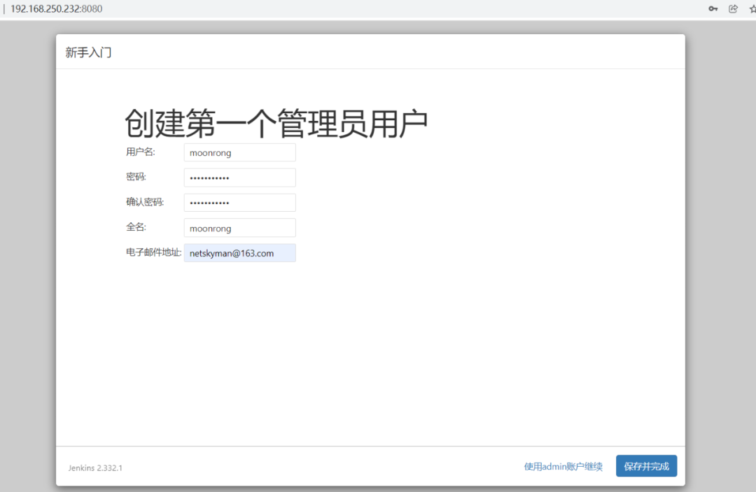 输入用户:moonrong,密码:superman123,邮箱:netskyman@163.com等信息。