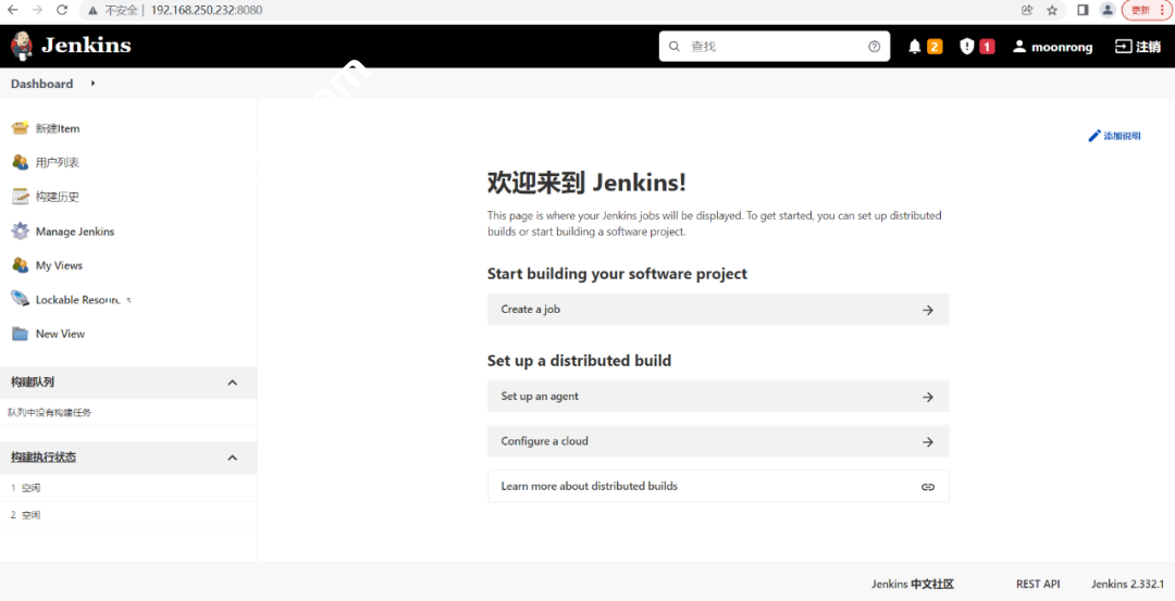 至此, jenkins部署完成,点击开始使用 jenkins,进入主界面。