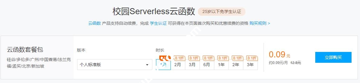 腾讯云校园优惠活动持续了很久,昨天看到又多了一个云函数优惠,也就是最近比较热门的 Serverless,这个东西还是挺好用的,是一个最近的热门研究方向,也就是常说的 Function as a Service,FaaS。腾讯云 Serverless 优惠对于之前已经认证的校园账户也可以购买,所以受众面很广,新老用户都可以,新老校园用户都可以,甚至 25 岁以下是不需要学生认证的,直接可以买。