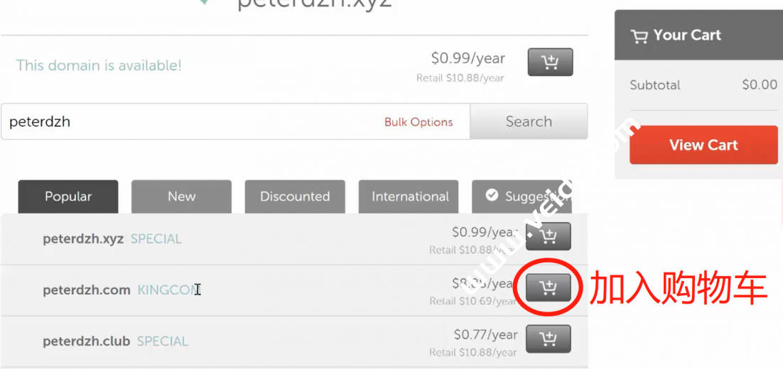 在搜索结果中,您可以查看到不同后缀名的网站域名,比如 peterdzh.xyz, peterdzh.com, peterdzh.club 等等。Namecheap 常常会给您提供超几十种不同的后缀名,大家可以按照个人需求选择。我们主要推荐大家选择.com, .net 或者 .org 。