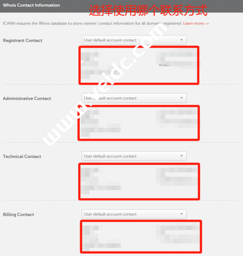下面进入了一个新的页面“Whois Contact Information”,请检查您的联系方式是否正确。