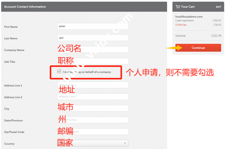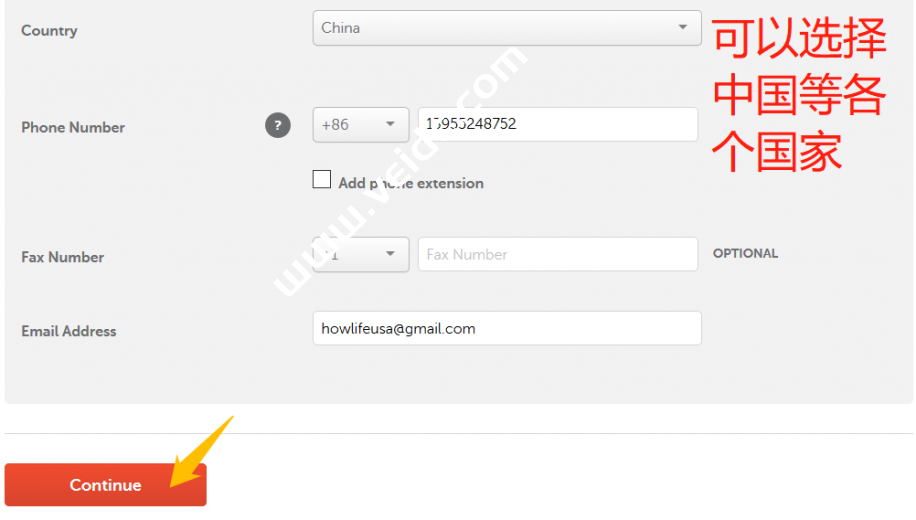 在上图中的“国家”选项中,您可以选择任何的国家,比如中国、英国、美国。填写完成后,请点击最下方的按钮【Continue】,您也可以在页面右侧找到这个按钮。