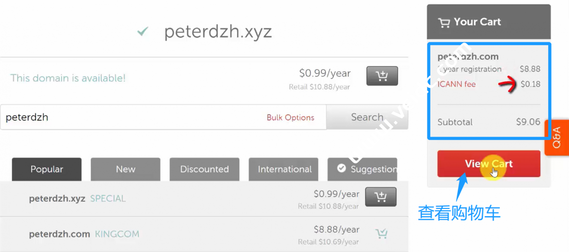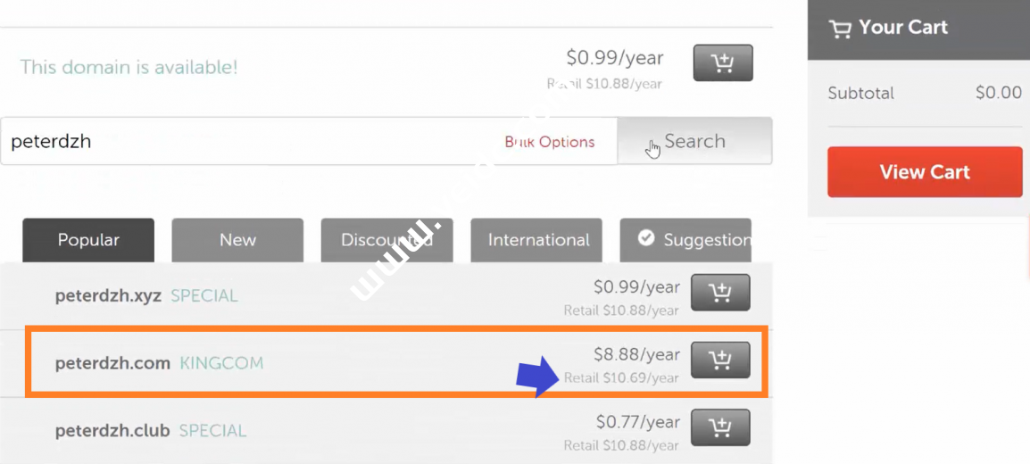 找到您所喜欢的后缀名,点击右侧的购物车按钮: