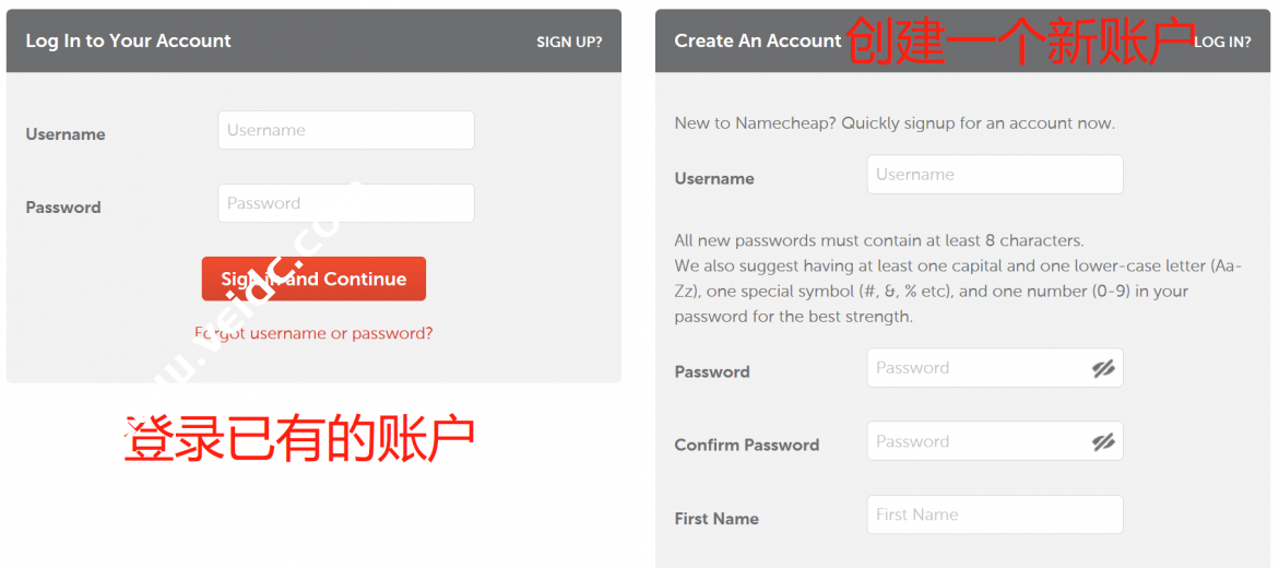 如果您是第一次使用Namecheap,那么需要创建一个新账户 (如下图右侧);如果您已经有Namecheap账户,直接登陆就可以了 (如下图中左侧)。