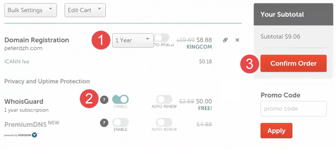 - “WhoisGuard” 这一项是用来保护您在申请时的个人信息 (比如姓名和地址)不被公开;请一定要选中此项,第一年免费,第二年的价格为$2.88/年。