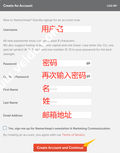下面以“创建一个新账户”为例,您需要输入“用户名”、“密码”、“姓名”和“邮箱”。请保证您的邮箱也填写正确,注册完成后,Namecheap 需要给您的邮箱发送邮件,完成最后的注册步骤。