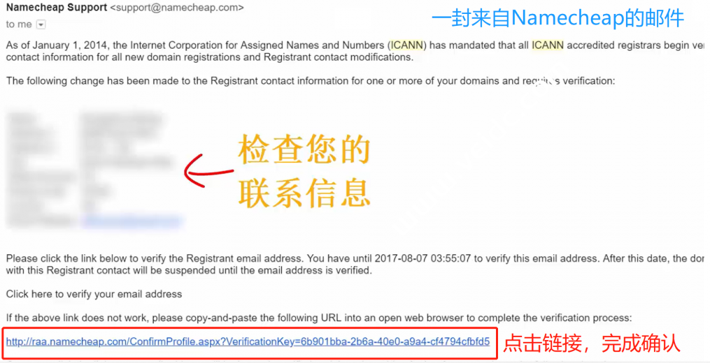 注册完成后,Namecheap 会给您的注册邮箱发送一封邮件,提示您,再次检查您的联系信息是否正确。