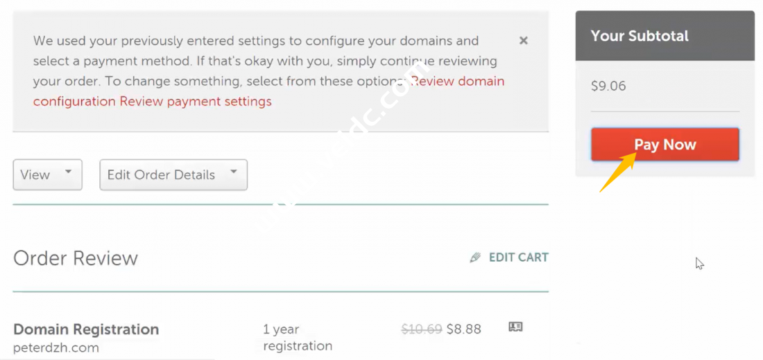 在最终付款之前,您还有一次机会,查看您的信息是否正确。如果没有问题,请在下图中,点击右侧的按钮【Pay Now】,完成付款: