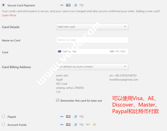 进入付款页面后,请填写付款信息。您可以使用Visa、American Express、Discover、和Master Card等常用的信用卡付款;同时,您也可以使用 Paypal 或者比特币 (Bitcoin) 付款: