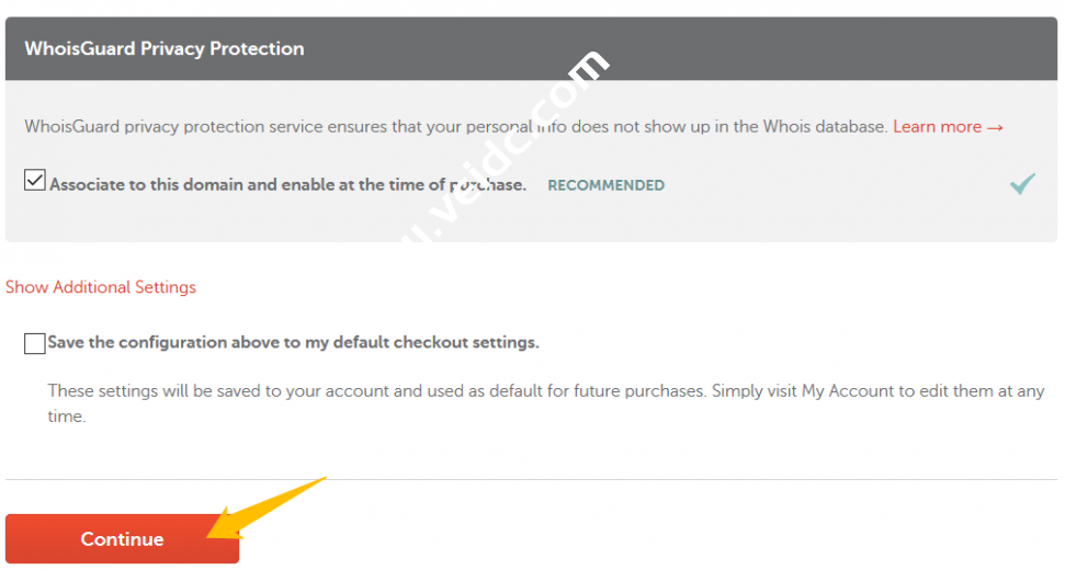 还在同一页面,继续滚动鼠标。继续选择“WhoisGuard Privacy Protection”,基本不需要修改,保持默认,直接点击最下方的按钮【Continue】: