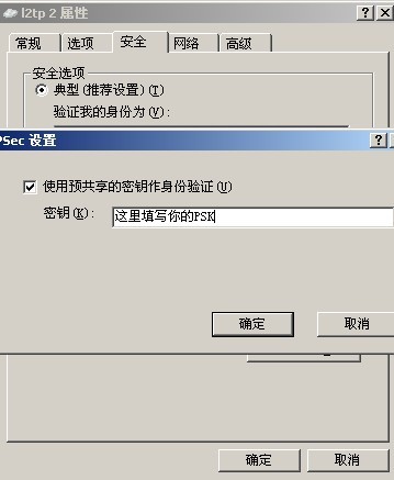 此时需要输入IP段与PSK,值得注意的是,如果希望L2TP的IP段是 10.0.0.0 的话,则在脚本的IP-RANGE中输入 “10.0.0″。PSK 是 l2tp client 共同使用的密匙,同样是必填的。 输入了IP段和PSK之后,程序会显示你的VPS当前的IP(IPV4)、L2TP的本地IP、分配给客户端的IP段以及你所设置的PSK,请确认无误后,按任意键,程序便会开始自动配置。安装完毕后会运行 ipsec verify,如果与上图一致,证明配置成功!用于测试的用户名与密码分别是:test / test123,记录于 /etc/ppp/chap-secrets 文件当中。 客户端设置(以 Windows XP 为例): 创建一个VPN连接: