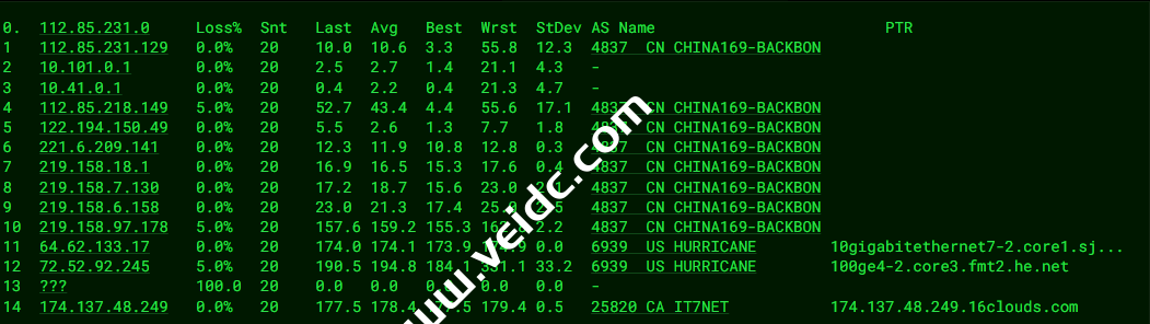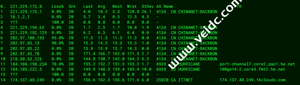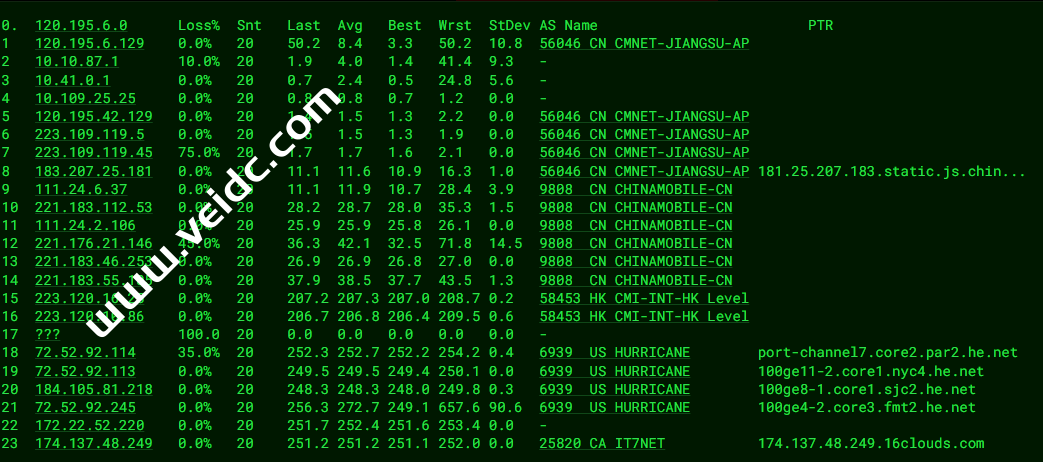 [Info] 测试路由 到 上海电信(天翼云) 中 ... traceroute to 101.227.255.45 (101.227.255.45), 30 hops max, 32 byte packets 1 172.22.52.200 2.32 ms * LAN Address 2 e0-38.switch11.fmt2.he.net (216.218.193.157) 0.38 ms AS6939 United States, California, Fremont, he.net 3 port-channel3.core2.pao1.he.net (184.105.222.6) 1.25 ms AS6939 United States, California, Palo Alto, he.net 4 100ge5-2.core1.lax2.he.net (184.105.81.102) 9.05 ms AS6939 United States, California, Los Angeles, he.net 5 218.30.53.225 13.74 ms AS4134 United States, ChinaTelecom 6 * 7 * 8 202.97.83.34 173.58 ms AS4134 China, Shanghai, ChinaTelecom 9 * 10 124.74.166.146 146.94 ms AS4812 China, Shanghai, ChinaTelecom 11 * 12 * 13 * 14 * 15 * 16 * 17 * 18 * 19 * 20 * 21 * 22 * 23 * 24 * 25 * 26 * 27 * 28 * 29 * 30 * [Info] 测试路由 到 上海电信(天翼云) 完成 ! [Info] 测试路由 到 厦门电信CN2 中 ... traceroute to 117.28.254.129 (117.28.254.129), 30 hops max, 32 byte packets 1 172.22.52.200 0.94 ms * LAN Address 2 e0-38.switch11.fmt2.he.net (216.218.193.157) 0.55 ms AS6939 United States, California, Fremont, he.net 3 100ge14-2.core1.sjc2.he.net (72.52.92.246) 0.83 ms AS6939 United States, California, San Jose, he.net 4 * 5 * 6 * 7 port-channel7.core2.osa1.he.net (184.104.198.218) 112.27 ms AS6939 Japan, Osaka, he.net 8 * 9 chinatelecomglobal-as4809.sgix.sg.102.16.103.in-addr.arpa (103.16.102.53) 179.71 ms * Singapore, sgix.sg 10 59.43.189.205 223.82 ms * China, Guangdong, Guangzhou, ChinaTelecom 11 * 12 59.43.130.125 224.47 ms * China, Guangdong, Guangzhou, ChinaTelecom 13 59.43.140.34 238.34 ms * China, Fujian, ChinaTelecom 14 * 15 27.148.195.94 217.66 ms AS133775 China, Fujian, Xiamen, ChinaTelecom 16 117.25.141.106 215.56 ms AS133775 China, Fujian, Xiamen, ChinaTelecom 17 117.28.254.129 238.49 ms AS4809 China, Fujian, Xiamen, ChinaTelecom [Info] 测试路由 到 厦门电信CN2 完成 ! [Info] 测试路由 到 浙江杭州联通 中 ... traceroute to 101.71.241.238 (101.71.241.238), 30 hops max, 32 byte packets 1 172.22.52.200 0.95 ms * LAN Address 2 e0-38.switch11.fmt2.he.net (216.218.193.157) 0.42 ms AS6939 United States, California, Fremont, he.net 3 100ge14-2.core1.sjc2.he.net (72.52.92.246) 0.83 ms AS6939 United States, California, San Jose, he.net 4 china169-backbone-as4837.10gigabitethernet9-2.core1.sjc2.he.net (184.105.143.82) 4.49 ms AS6939 United States, California, San Jose, he.net 5 219.158.6.5 193.90 ms AS4837 China, Shanghai, ChinaUnicom 6 219.158.113.126 132.21 ms AS4837 China, Shanghai, ChinaUnicom 7 219.158.113.101 129.22 ms AS4837 China, Shanghai, ChinaUnicom 8 219.158.106.122 166.02 ms AS4837 China, Zhejiang, Hangzhou, ChinaUnicom 9 * 10 * 11 * 12 * 13 * 14 * 15 * 16 * 17 * 18 * 19 * 20 * 21 * 22 * 23 * 24 * 25 * 26 * 27 * 28 * 29 * 30 * [Info] 测试路由 到 浙江杭州联通 完成 ! [Info] 测试路由 到 浙江杭州移动 中 ... traceroute to 112.17.0.106 (112.17.0.106), 30 hops max, 32 byte packets 1 172.22.52.200 1.39 ms * LAN Address 2 e0-38.switch11.fmt2.he.net (216.218.193.157) 0.54 ms AS6939 United States, California, Fremont, he.net 3 100ge14-2.core1.sjc2.he.net (72.52.92.246) 0.77 ms AS6939 United States, California, San Jose, he.net 4 cmi-int-hk-as58453.10gigabitethernet13-11.core1.sjc2.he.net (216.218.132.102) 31.24 ms AS6939 United States, California, San Jose, he.net 5 223.120.6.69 7.90 ms AS58453 United States, California, San Jose, ChinaMobile 6 223.120.12.26 174.44 ms AS58453 China, Shanghai, ChinaMobile 7 221.183.55.26 204.19 ms AS9808 China, Shanghai, ChinaMobile 8 221.176.22.205 295.65 ms AS9808 China, Shanghai, ChinaMobile 9 221.176.22.13 278.23 ms AS9808 China, Shanghai, ChinaMobile 10 111.24.17.61 276.16 ms AS9808 China, Shanghai, ChinaMobile 11 221.183.10.6 212.18 ms AS9808 China, Zhejiang, Hangzhou, ChinaMobile 12 * 13 117.148.185.114 221.04 ms AS56041 China, Zhejiang, Hangzhou, ChinaMobile 14 * 15 * 16 * 17 * 18 * 19 * 20 * 21 * 22 * 23 * 24 * 25 * 26 * 27 * 28 * 29 * 30 * [Info] 测试路由 到 浙江杭州移动 完成 ! [Info] 测试路由 到 北京教育网 中 ... traceroute to 202.205.6.30 (202.205.6.30), 30 hops max, 32 byte packets 1 172.22.52.200 1.72 ms * LAN Address 2 e0-38.switch11.fmt2.he.net (216.218.193.157) 0.41 ms AS6939 United States, California, Fremont, he.net 3 * 4 * 5 * 6 * 7 100ge10-1.core1.hkg1.he.net (184.105.64.126) 146.91 ms AS6939 China, Hong Kong, he.net 8 * 9 multidata1-10g.hkix.net (123.255.91.118) 179.18 ms * China, Hong Kong, hkix.net 10 101.4.114.181 168.43 ms AS4538 China, Beijing, CHINAEDU 11 * 12 * 13 101.4.118.213 168.09 ms AS4538 China, Beijing, CHINAEDU 14 101.4.113.110 167.62 ms AS4538 China, Beijing, CHINAEDU 15 219.224.102.230 187.56 ms AS4538 China, Beijing, CHINAEDU 16 * 17 * 18 * 19 * 20 101.4.130.54 169.57 ms AS4538 China, Beijing, CHINAEDU 21 101.4.130.53 177.60 ms AS4538 China, Beijing, CHINAEDU 22 * 23 * 24 101.4.130.54 169.40 ms AS4538 China, Beijing, CHINAEDU 25 101.4.130.53 171.57 ms AS4538 China, Beijing, CHINAEDU 26 * 27 * 28 101.4.130.54 169.48 ms AS4538 China, Beijing, CHINAEDU 29 * 30 * [Info] 测试路由 到 北京教育网 完成 ! [Info] 四网路由快速测试 已完成 !
