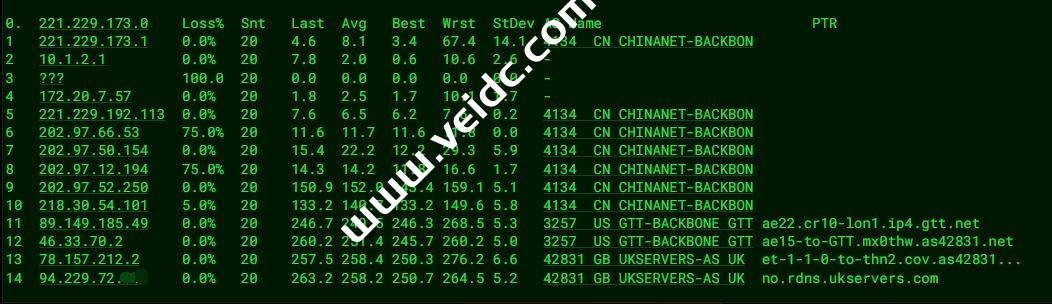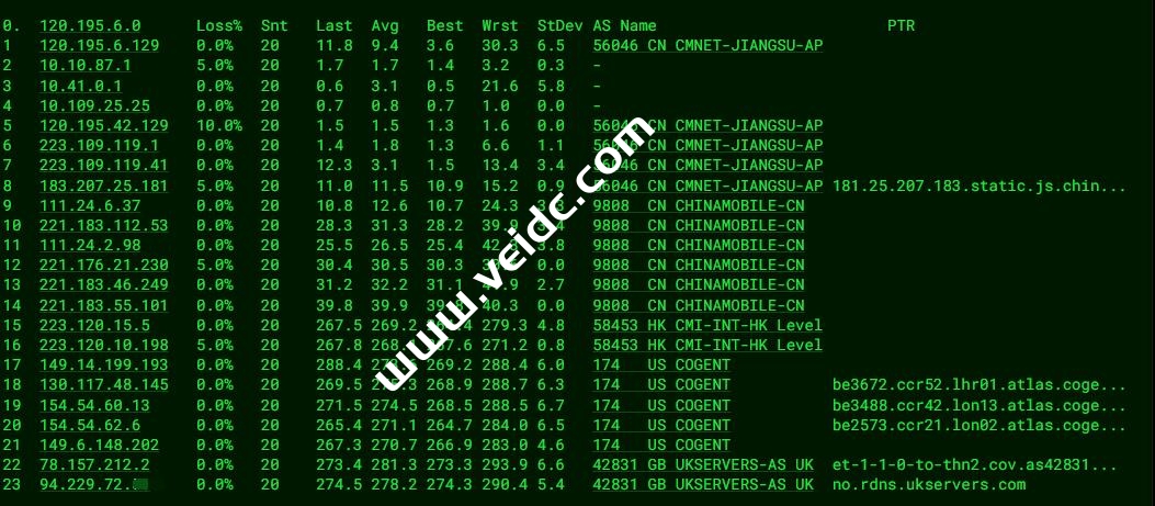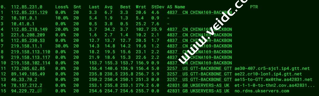 [Info] 测试路由 到 上海电信(天翼云) 中 ... traceroute to 101.227.255.45 (101.227.255.45), 30 hops max, 32 byte packets 1 no.rdns.ukservers.com (5.101.149.193) 18.50 ms AS42831 United Kingdom, West Midlands County, Coventry, ukservers.com 2 31-132-6-142.as42831.net (31.132.6.142) 6.03 ms AS42831 United Kingdom, London, ukservers.com 3 * 4 be2350.ccr42.lon13.atlas.cogentco.com (130.117.51.137) 5.75 ms AS174 United Kingdom, London, cogentco.com 5 be2382.rcr21.b015533-1.lon13.atlas.cogentco.com (154.54.61.162) 5.92 ms AS174 United Kingdom, London, cogentco.com 6 chinatelecom.demarc.cogentco.com (149.14.81.226) 14.36 ms AS174 United Kingdom, London, cogentco.com 7 * 8 * 9 * 10 61.152.25.21 250.84 ms AS4812 China, Shanghai, ChinaTelecom 11 101.95.207.2 257.54 ms AS4812 China, Shanghai, ChinaTelecom 12 * 13 * 14 * 15 * 16 * 17 * 18 * 19 * 20 * 21 * 22 * 23 * 24 * 25 * 26 * 27 * 28 * 29 * 30 * [Info] 测试路由 到 上海电信(天翼云) 完成 ! [Info] 测试路由 到 厦门电信CN2 中 ... traceroute to 117.28.254.129 (117.28.254.129), 30 hops max, 32 byte packets 1 no.rdns.ukservers.com (5.101.149.193) 0.88 ms AS42831 United Kingdom, West Midlands County, Coventry, ukservers.com 2 31-132-6-142.as42831.net (31.132.6.142) 5.61 ms AS42831 United Kingdom, London, ukservers.com 3 ae31.cr10-lon1.ip4.gtt.net (46.33.70.1) 5.56 ms AS3257 United Kingdom, London, gtt.net 4 ae0.cr12-lon1.ip4.gtt.net (141.136.107.2) 5.70 ms AS3257 United Kingdom, London, gtt.net 5 ae-11.edge7.London1.Level3.net (4.68.72.201) 6.30 ms AS3356 United Kingdom, London, level3.com 6 * 7 CHINA-TELEC.ear1.London15.Level3.net (217.163.47.130) 6.11 ms AS3356 United Kingdom, London, level3.com 8 59.43.250.1 235.19 ms * China, ChinaTelecom 9 * 10 59.43.130.209 242.96 ms * China, Shanghai, ChinaTelecom 11 59.43.138.186 237.39 ms * China, Fujian, ChinaTelecom 12 * 13 27.159.81.218 289.33 ms AS133775 China, Fujian, Xiamen, ChinaTelecom 14 117.25.141.110 273.86 ms AS133775 China, Fujian, Xiamen, ChinaTelecom 15 117.28.254.129 241.67 ms AS4809 China, Fujian, Xiamen, ChinaTelecom [Info] 测试路由 到 厦门电信CN2 完成 ! [Info] 测试路由 到 浙江杭州联通 中 ... traceroute to 101.71.241.238 (101.71.241.238), 30 hops max, 32 byte packets 1 no.rdns.ukservers.com (5.101.149.193) 0.34 ms AS42831 United Kingdom, West Midlands County, Coventry, ukservers.com 2 31-132-6-142.as42831.net (31.132.6.142) 5.51 ms AS42831 United Kingdom, London, ukservers.com 3 * 4 be2348.ccr41.lon13.atlas.cogentco.com (130.117.51.73) 5.99 ms AS174 United Kingdom, London, cogentco.com 5 be12194.ccr41.ams03.atlas.cogentco.com (154.54.56.94) 12.85 ms AS174 Netherlands, North Holland, Amsterdam, cogentco.com 6 be2813.ccr41.fra03.atlas.cogentco.com (130.117.0.122) 19.47 ms AS174 Germany, Hesse, Frankfurt, cogentco.com 7 be2845.rcr22.fra06.atlas.cogentco.com (154.54.56.190) 20.06 ms AS174 Germany, Hesse, Frankfurt, cogentco.com 8 be2844.agr21.fra06.atlas.cogentco.com (130.117.0.30) 19.75 ms AS174 Germany, Hesse, Frankfurt, cogentco.com 9 154.25.14.78 20.14 ms AS174 Europe Regions, cogentco.com 10 149.11.84.202 242.87 ms AS174 Germany, Hesse, Frankfurt, cogentco.com 11 219.158.20.173 237.38 ms AS4837 China, Guangdong, Guangzhou, ChinaUnicom 12 219.158.24.133 267.39 ms AS4837 China, Guangdong, Guangzhou, ChinaUnicom 13 219.158.8.113 255.31 ms AS4837 China, Guangdong, Guangzhou, ChinaUnicom 14 219.158.114.206 234.68 ms AS4837 China, Zhejiang, Hangzhou, ChinaUnicom 15 101.69.245.206 254.17 ms AS4837 China, Zhejiang, Hangzhou, ChinaUnicom 16 * 17 * 18 * 19 * 20 * 21 * 22 * 23 * 24 * 25 * 26 * 27 * 28 * 29 * 30 * [Info] 测试路由 到 浙江杭州联通 完成 ! [Info] 测试路由 到 浙江杭州移动 中 ... traceroute to 112.17.0.106 (112.17.0.106), 30 hops max, 32 byte packets 1 no.rdns.ukservers.com (5.101.149.193) 0.46 ms AS42831 United Kingdom, West Midlands County, Coventry, ukservers.com 2 31-132-6-142.as42831.net (31.132.6.142) 5.64 ms AS42831 United Kingdom, London, ukservers.com 3 ae31.cr10-lon1.ip4.gtt.net (46.33.70.1) 5.72 ms AS3257 United Kingdom, London, gtt.net 4 ae22.cr3-lax1.ip4.gtt.net (89.149.181.102) 131.20 ms AS3257 United States, California, Los Angeles, gtt.net 5 ip4.gtt.net (173.205.45.154) 136.48 ms AS3257 United States, California, Los Angeles, gtt.net 6 223.120.6.217 137.94 ms AS58453 United States, California, Los Angeles, ChinaMobile 7 223.120.12.18 266.28 ms AS58453 China, Shanghai, ChinaMobile 8 221.183.55.50 274.13 ms AS9808 China, Shanghai, ChinaMobile 9 221.183.25.193 265.64 ms AS9808 China, Shanghai, ChinaMobile 10 221.176.22.33 266.59 ms AS9808 China, Shanghai, ChinaMobile 11 111.24.4.77 267.25 ms AS9808 China, Shanghai, ChinaMobile 12 221.176.22.122 302.52 ms AS9808 China, Zhejiang, Hangzhou, ChinaMobile 13 * 14 112.17.194.138 274.87 ms AS56041 China, Zhejiang, Hangzhou, ChinaMobile 15 * 16 * 17 * 18 * 19 * 20 * 21 * 22 * 23 * 24 * 25 * 26 * 27 * 28 * 29 * 30 * [Info] 测试路由 到 浙江杭州移动 完成 ! [Info] 测试路由 到 北京教育网 中 ... traceroute to 202.205.6.30 (202.205.6.30), 30 hops max, 32 byte packets 1 no.rdns.ukservers.com (5.101.149.193) 0.30 ms AS42831 United Kingdom, West Midlands County, Coventry, ukservers.com 2 31-132-6-142.as42831.net (31.132.6.142) 5.62 ms AS42831 United Kingdom, London, ukservers.com 3 * 4 be2348.ccr41.lon13.atlas.cogentco.com (130.117.51.73) 5.56 ms AS174 United Kingdom, London, cogentco.com 5 be2317.ccr41.jfk02.atlas.cogentco.com (154.54.30.185) 75.42 ms AS174 United States, New York, New York City, cogentco.com 6 be2806.ccr41.dca01.atlas.cogentco.com (154.54.40.106) 81.06 ms AS174 United States, Virginia, Arlington, cogentco.com 7 be2112.ccr41.atl01.atlas.cogentco.com (154.54.7.158) 95.30 ms AS174 United States, Georgia, Atlanta, cogentco.com 8 be2687.ccr41.iah01.atlas.cogentco.com (154.54.28.70) 108.59 ms AS174 United States, Texas, Houston, cogentco.com 9 be2927.ccr21.elp01.atlas.cogentco.com (154.54.29.222) 124.89 ms AS174 United States, Texas