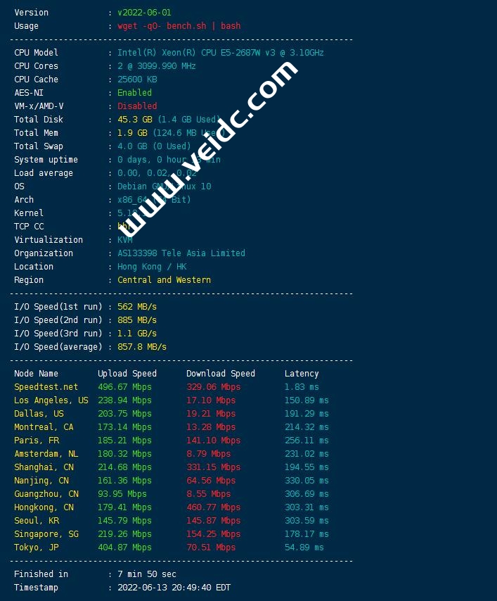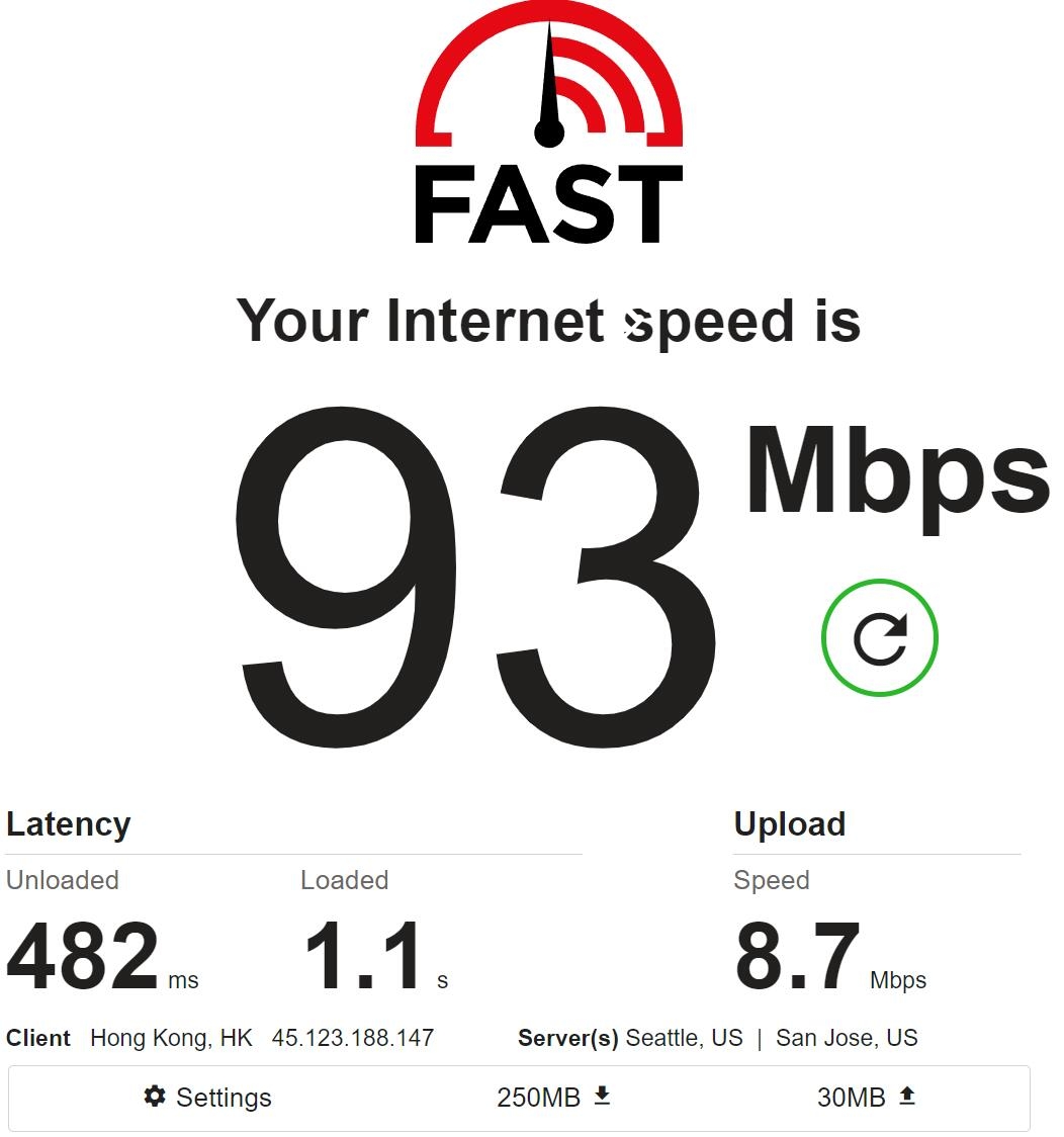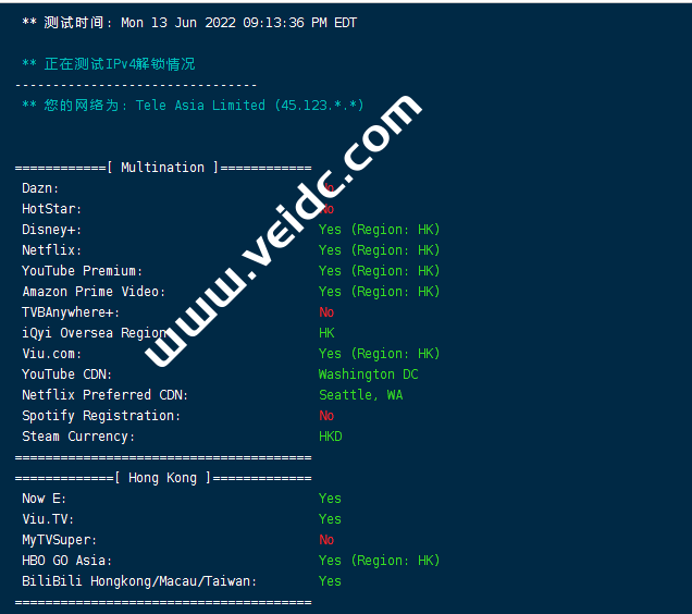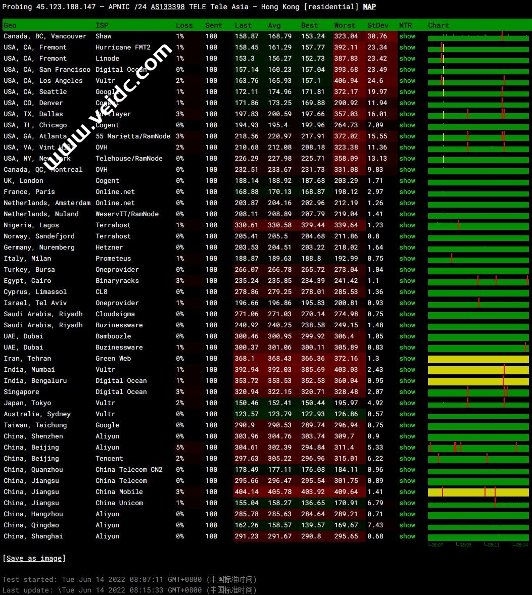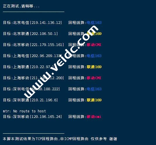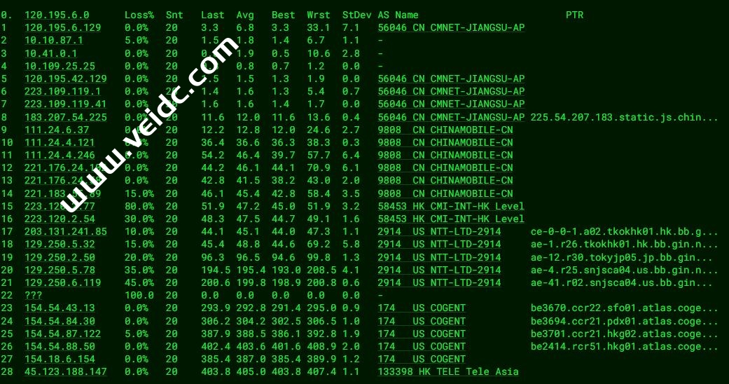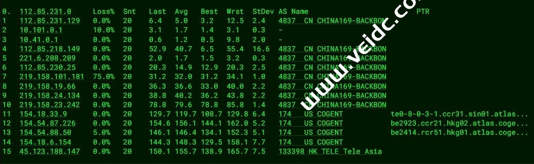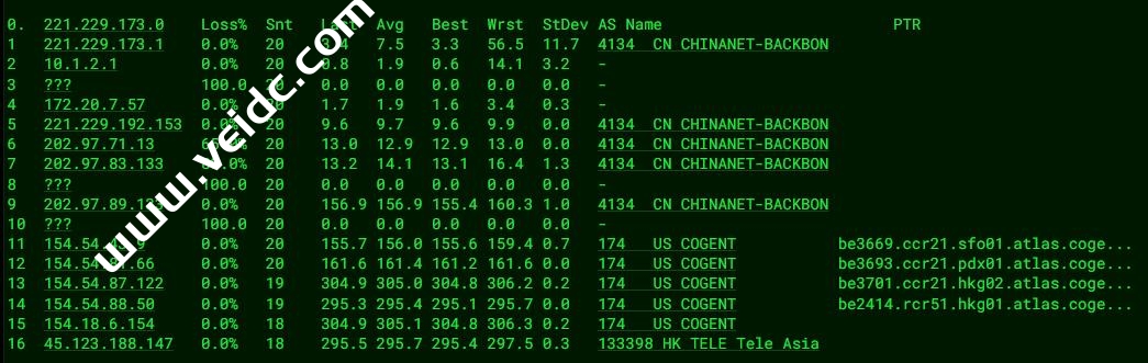 [Info] 测试路由 到 上海电信(天翼云) 中 ... traceroute to 101.227.255.45 (101.227.255.45), 30 hops max, 32 byte packets 1 45.123.189.1 0.93 ms AS133398 China, Hong Kong, hosthongkong.net 2 gi100-0-0-5.1102.rcr51.hkg01.atlas.cogentco.com (154.18.6.153) 1.74 ms AS174 China, Hong Kong, cogentco.com 3 be2414.ccr21.hkg02.atlas.cogentco.com (154.54.88.49) 3.21 ms AS174 China, Hong Kong, cogentco.com 4 be3701.ccr21.pdx01.atlas.cogentco.com (154.54.87.121) 135.98 ms AS174 United States, Oregon, Portland, cogentco.com 5 be3693.ccr21.sfo01.atlas.cogentco.com (154.54.81.65) 151.36 ms AS174 United States, California, San Francisco, cogentco.com 6 be3669.ccr41.sjc03.atlas.cogentco.com (154.54.43.10) 152.59 ms AS174 United States, California, San Jose, cogentco.com 7 38.104.138.106 154.53 ms AS174 United States, California, San Jose, cogentco.com 8 * 9 * 10 * 11 61.152.24.233 289.45 ms AS4812 China, Shanghai, ChinaTelecom 12 * 13 * 14 * 15 * 16 * 17 * 18 * 19 * 20 * 21 * 22 * 23 * 24 * 25 * 26 * 27 * 28 * 29 * 30 * [Info] 测试路由 到 上海电信(天翼云) 完成 ! [Info] 测试路由 到 厦门电信CN2 中 ... traceroute to 117.28.254.129 (117.28.254.129), 30 hops max, 32 byte packets 1 45.123.189.1 1.46 ms AS133398 China, Hong Kong, hosthongkong.net 2 gi100-0-0-5.1102.rcr51.hkg01.atlas.cogentco.com (154.18.6.153) 1.79 ms AS174 China, Hong Kong, cogentco.com 3 pccw.hkg01.atlas.cogentco.com (154.54.140.66) 2.07 ms AS174 China, Hong Kong, cogentco.com 4 HundredGE0-5-0-0.br03.hkg15.pccwbtn.net (63.223.17.162) 2.44 ms AS3491,AS31713 China, Hong Kong, pccw.com 5 HundredGE0-5-0-0.br03.hkg15.pccwbtn.net (63.223.17.162) 5.09 ms AS3491,AS31713 China, Hong Kong, pccw.com 6 63-218-211-10.static.pccwglobal.net (63.218.211.10) 159.89 ms AS3491,AS31713 China, Hong Kong, pccw.com 7 * 8 * 9 * 10 * 11 110.80.128.94 162.48 ms AS133775 China, Fujian, Xiamen, ChinaTelecom 12 27.148.195.94 174.63 ms AS133775 China, Fujian, Xiamen, ChinaTelecom 13 117.25.141.106 171.80 ms AS133775 China, Fujian, Xiamen, ChinaTelecom 14 117.28.254.129 180.59 ms AS4809 China, Fujian, Xiamen, ChinaTelecom [Info] 测试路由 到 厦门电信CN2 完成 ! [Info] 测试路由 到 浙江杭州联通 中 ... traceroute to 101.71.241.238 (101.71.241.238), 30 hops max, 32 byte packets 1 45.123.189.1 0.48 ms AS133398 China, Hong Kong, hosthongkong.net 2 gi100-0-0-5.1102.rcr51.hkg01.atlas.cogentco.com (154.18.6.153) 1.82 ms AS174 China, Hong Kong, cogentco.com 3 be2414.ccr21.hkg02.atlas.cogentco.com (154.54.88.49) 2.79 ms AS174 China, Hong Kong, cogentco.com 4 be2923.ccr31.sin01.atlas.cogentco.com (154.54.87.225) 33.20 ms AS174 Singapore, cogentco.com 5 154.18.33.2 74.74 ms AS174 Singapore, cogentco.com 6 219.158.17.141 119.41 ms AS4837 China, ChinaUnicom 7 219.158.103.37 122.44 ms AS4837 China, Guangdong, Guangzhou, ChinaUnicom 8 219.158.8.117 120.54 ms AS4837 China, Guangdong, Guangzhou, ChinaUnicom 9 219.158.106.70 139.19 ms AS4837 China, Zhejiang, Hangzhou, ChinaUnicom 10 101.71.244.94 149.37 ms AS4837 China, Zhejiang, Hangzhou, ChinaUnicom 11 * 12 * 13 * 14 * 15 * 16 * 17 * 18 * 19 * 20 * 21 * 22 * 23 * 24 * 25 * 26 * 27 * 28 * 29 * 30 * [Info] 测试路由 到 浙江杭州联通 完成 ! [Info] 测试路由 到 浙江杭州移动 中 ... traceroute to 112.17.0.106 (112.17.0.106), 30 hops max, 32 byte packets 1 45.123.189.1 0.32 ms AS133398 China, Hong Kong, hosthongkong.net 2 gi100-0-0-5.1102.rcr51.hkg01.atlas.cogentco.com (154.18.6.153) 4.81 ms AS174 China, Hong Kong, cogentco.com 3 be2414.ccr21.hkg02.atlas.cogentco.com (154.54.88.49) 3.02 ms AS174 China, Hong Kong, cogentco.com 4 be2923.ccr31.sin01.atlas.cogentco.com (154.54.87.225) 176.63 ms AS174 Singapore, cogentco.com 5 be2913.ccr41.lax04.atlas.cogentco.com (154.54.27.54) 180.46 ms AS174 United States, California, Los Angeles, cogentco.com 6 be3271.ccr41.lax01.atlas.cogentco.com (154.54.42.101) 180.65 ms AS174 United States, California, Los Angeles, cogentco.com 7 be3243.ccr41.lax05.atlas.cogentco.com (154.54.27.118) 180.39 ms AS174 United States, California, Los Angeles, cogentco.com 8 * 9 * 10 223.120.12.18 407.32 ms AS58453 China, Shanghai, ChinaMobile 11 221.183.55.50 414.73 ms AS9808 China, Shanghai, ChinaMobile 12 * 13 221.176.22.33 414.19 ms AS9808 China, Shanghai, ChinaMobile 14 111.24.17.61 412.56 ms AS9808 China, Shanghai, ChinaMobile 15 221.183.108.122 416.61 ms AS9808 China, Zhejiang, Hangzhou, ChinaMobile 16 * 17 * 18 * 19 * 20 * 21 * 22 * 23 * 24 * 25 * 26 * 27 * 28 * 29 * 30 * [Info] 测试路由 到 浙江杭州移动 完成 ! [Info] 测试路由 到 北京教育网 中 ... traceroute to 202.205.6.30 (202.205.6.30), 30 hops max, 32 byte packets 1 45.123.189.1 0.58 ms AS133398 China, Hong Kong, hosthongkong.net 2 gi100-0-0-5.1102.rcr51.hkg01.atlas.cogentco.com (154.18.6.153) 1.97 ms AS174 China, Hong Kong, cogentco.com 3 be2414.ccr21.hkg02.atlas.cogentco.com (154.54.88.49) 2.40 ms AS174 China, Hong Kong, cogentco.com 4 be2327.ccr41.lax01.atlas.cogentco.com (154.54.0.5) 151.71 ms AS174 United States, California, Los Angeles, cogentco.com 5 be3271.ccr41.lax04.atlas.cogentco.com (154.54.42.102) 150.94 ms AS174 United States, California, Los Angeles, cogentco.com 6 38.88.196.186 153.86 ms AS174 United States, California, Los Angeles, cogentco.com 7 101.4.117.169 297.78 ms AS4538 China, Beijing, CHINAEDU 8 * 9 101.4.118.213 302.95 ms AS4538 China, Beijing, CHINAEDU 10 101.4.113.110 295.70 ms AS4538 China, Beijing, CHINAEDU 11 219.224.102.230 296.10 ms AS4538 China, Beijing, CHINAEDU 12 101.4.130.54 296.55 ms AS4538 China, Beijing, CHINAEDU 13 * 14 * 15 101.4.130.53 296.30 ms AS4538 China, Beijing, CHINAEDU 16 * 17 * 18 * 19 * 20 * 21 * 22 101.4.130.54 296.96 ms AS4538 China, Beijing, CHINAEDU 23 101.4.130.53 296.64 ms AS4538 China, Beijing, CHINAEDU 24 * 25 * 26 * 27 * 28 101.4.130.54 296.75 ms AS4538 China, Beijing, CHINAEDU 29 * 30 * [Info] 测试路由 到 北京教育网 完成 ! [Info] 四网路由快速测试 已完成 !