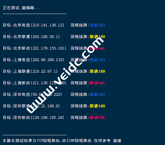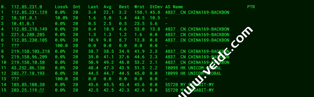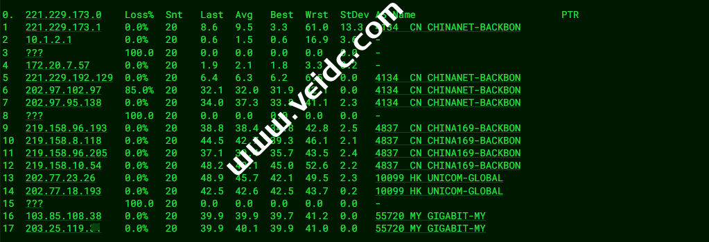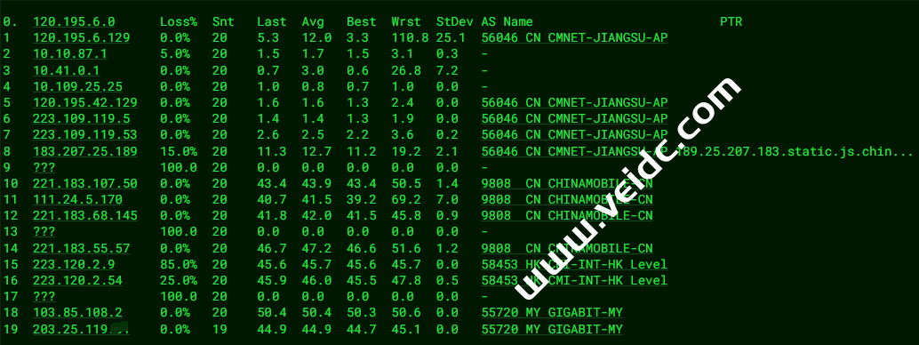[Info] 测试路由 到 上海电信(天翼云) 中 ... traceroute to 101.227.255.45 (101.227.255.45), 30 hops max, 32 byte packets 1 119.160.232.194 4.51 ms AS55720 中国, 香港, egcloudent.com 2 * 3 202.77.19.169 2.22 ms AS10099 中国, 香港, chinaunicom.com, 联通 4 203.160.84.121 7.97 ms AS10099 中国, 香港, chinaunicom.com, 联通 5 43.252.86.141 4.95 ms AS10099 中国, 香港, chinaunicom.com, 联通 6 219.158.10.61 5.78 ms AS4837 中国, 广东, 广州, chinaunicom.com, 联通 7 219.158.103.37 13.52 ms AS4837 中国, 广东, 广州, chinaunicom.com, 联通 8 * 9 * 10 219.158.109.170 57.87 ms AS4837 中国, 上海, chinaunicom.com, 联通 11 202.97.17.205 55.96 ms AS4134 中国, 上海, chinatelecom.com.cn, 电信 12 * 13 101.95.88.81 47.38 ms AS4812 中国, 上海, chinatelecom.com.cn, 电信 14 * 15 * 16 * 17 * 18 * 19 * 20 * 21 * 22 * 23 * 24 * 25 * 26 * 27 * 28 * 29 * 30 * [Info] 测试路由 到 上海电信(天翼云) 完成 ! [Info] 测试路由 到 厦门电信CN2 中 ... traceroute to 117.28.254.129 (117.28.254.129), 30 hops max, 32 byte packets 1 119.160.232.194 0.51 ms AS55720 中国, 香港, egcloudent.com 2 * 3 121.59.100.237 0.66 ms AS23764 中国, 香港, chinatelecom.com.cn, 电信 4 69.194.166.61 1.31 ms AS23764 中国, 香港, chinatelecom.com.cn, 电信 5 203.22.178.74 1.94 ms * 中国, 香港, chinatelecom.com.cn, 电信 6 59.43.183.105 15.46 ms * 中国, 广东, 广州, chinatelecom.com.cn, 电信 7 * 8 59.43.130.101 6.82 ms * 中国, 广东, 广州, chinatelecom.com.cn, 电信 9 59.43.140.34 21.68 ms * 中国, 福建, chinatelecom.com.cn, 电信 10 110.80.128.94 24.37 ms AS133775 中国, 福建, 厦门, chinatelecom.com.cn, 电信 11 27.159.81.218 31.15 ms AS133775 中国, 福建, 厦门, chinatelecom.com.cn, 电信 12 117.25.141.110 31.72 ms AS133775 中国, 福建, 厦门, chinatelecom.com.cn, 电信 13 117.28.254.129 22.71 ms AS4809 中国, 福建, 厦门, chinatelecom.com.cn, 电信 [Info] 测试路由 到 厦门电信CN2 完成 ! [Info] 测试路由 到 浙江杭州联通 中 ... traceroute to 101.71.241.238 (101.71.241.238), 30 hops max, 32 byte packets 1 119.160.232.194 0.32 ms AS55720 中国, 香港, egcloudent.com 2 * 3 121.59.100.237 0.65 ms AS23764 中国, 香港, chinatelecom.com.cn, 电信 4 69.194.166.61 1.11 ms AS23764 中国, 香港, chinatelecom.com.cn, 电信 5 203.22.178.42 7.16 ms * 中国, 香港, chinatelecom.com.cn, 电信 6 59.43.248.109 29.24 ms * 中国, 上海, chinatelecom.com.cn, 电信 7 * 8 202.97.12.193 47.25 ms AS4134 中国, 上海, chinatelecom.com.cn, 电信 9 * 10 202.97.101.218 43.64 ms AS4134 中国, 浙江, 杭州, chinatelecom.com.cn, 电信 11 * 12 219.158.45.165 53.61 ms AS4837 中国, 浙江, 杭州, chinaunicom.com, 联通 13 219.158.7.197 51.37 ms AS4837 中国, 浙江, 杭州, chinaunicom.com, 联通 14 101.71.244.94 54.89 ms AS4837 中国, 浙江, 杭州, chinaunicom.com, 联通 15 * 16 * 17 * 18 * 19 * 20 * 21 * 22 * 23 * 24 * 25 * 26 * 27 * 28 * 29 * 30 * [Info] 测试路由 到 浙江杭州联通 完成 ! [Info] 测试路由 到 浙江杭州移动 中 ... traceroute to 112.17.0.106 (112.17.0.106), 30 hops max, 32 byte packets 1 119.160.232.194 0.33 ms AS55720 中国, 香港, egcloudent.com 2 * 3 202.77.19.169 2.16 ms AS10099 中国, 香港, chinaunicom.com, 联通 4 203.160.84.121 6.89 ms AS10099 中国, 香港, chinaunicom.com, 联通 5 43.252.86.141 2.67 ms AS10099 中国, 香港, chinaunicom.com, 联通 6 219.158.10.61 12.29 ms AS4837 中国, 广东, 广州, chinaunicom.com, 联通 7 219.158.97.26 9.30 ms AS4837 中国, 广东, 广州, chinaunicom.com, 联通 8 219.158.97.1 10.20 ms AS4837 中国, 广东, 广州, chinaunicom.com, 联通 9 * 10 219.158.7.202 32.88 ms AS4837 中国, 浙江, 杭州, chinaunicom.com, 联通 11 * 12 221.183.95.125 32.17 ms AS9808 中国, 浙江, 杭州, chinamobile.com, 移动 13 * 14 * 15 * 16 * 17 * 18 * 19 * 20 * 21 * 22 * 23 * 24 * 25 * 26 * 27 * 28 * 29 * 30 * [Info] 测试路由 到 浙江杭州移动 完成 ! [Info] 测试路由 到 北京教育网 中 ... traceroute to 202.205.6.30 (202.205.6.30), 30 hops max, 32 byte packets 1 119.160.232.194 0.39 ms AS55720 中国, 香港, egcloudent.com 2 * 3 multidata1-10g.hkix.net (123.255.91.118) 2.14 ms * 中国, 香港, hkix.net 4 101.4.114.181 35.51 ms AS4538 中国, 北京, edu.cn, 教育网 5 * 6 * 7 101.4.118.213 37.79 ms AS4538 中国, 北京, edu.cn, 教育网 8 * 9 219.224.102.230 36.20 ms AS4538 中国, 北京, edu.cn, 教育网 10 * 11 101.4.130.53 40.06 ms AS4538 中国, 北京, edu.cn, 教育网 12 * 13 * 14 * 15 * 16 * 17 * 18 * 19 101.4.130.53 40.38 ms AS4538 中国, 北京, edu.cn, 教育网 20 * 21 101.4.130.53 40.95 ms AS4538 中国, 北京, edu.cn, 教育网 22 101.4.130.54 39.05 ms AS4538 中国, 北京, edu.cn, 教育网 23 * 24 * 25 101.4.130.53 40.53 ms AS4538 中国, 北京, edu.cn, 教育网 26 101.4.130.54 39.32 ms AS4538 中国, 北京, edu.cn, 教育网 27 * 28 * 29 * 30 * [Info] 测试路由 到 北京教育网 完成 ! [Info] 四网路由快速测试 已完成 !