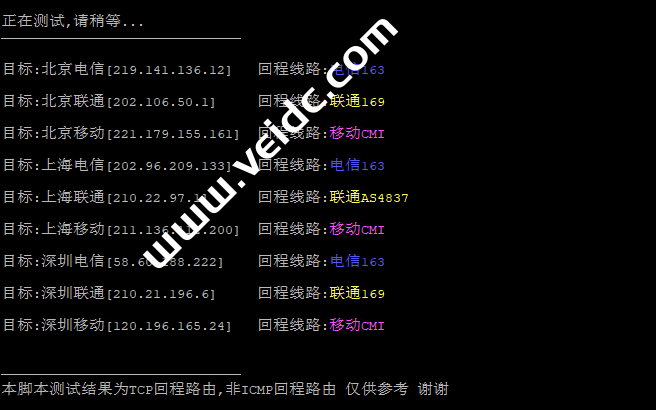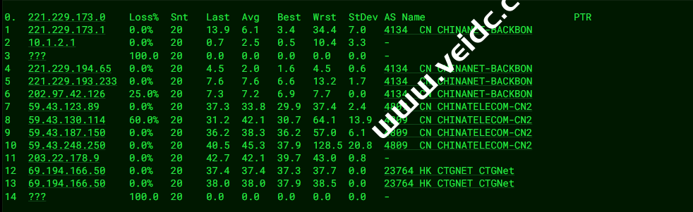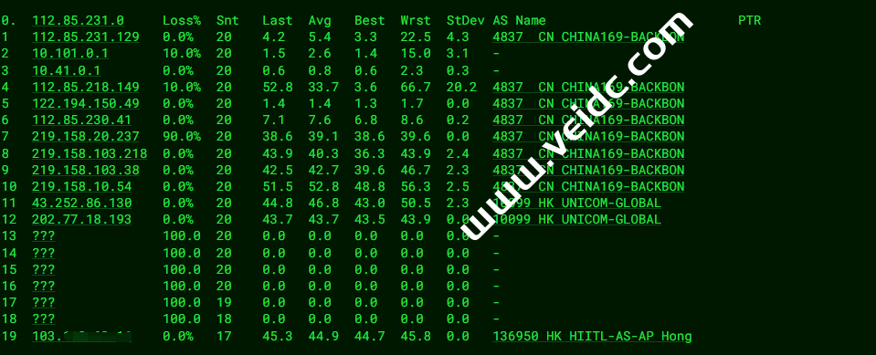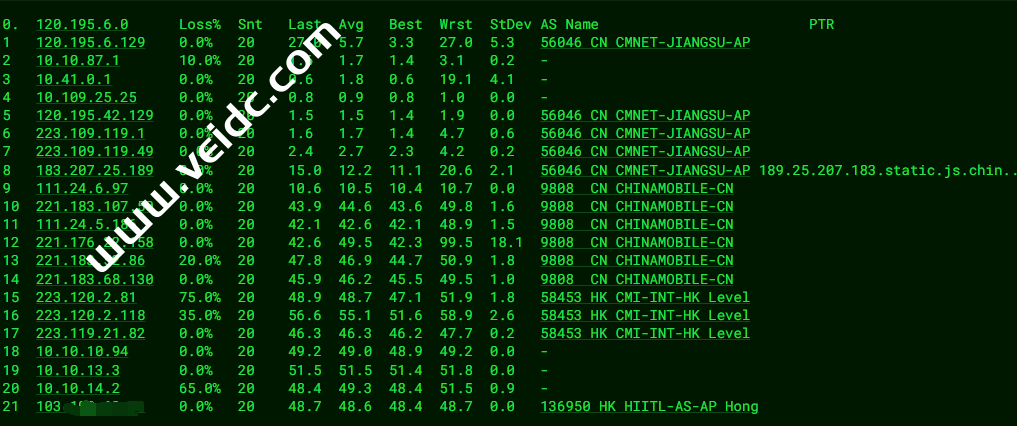 [Info] 测试路由 到 上海电信(天翼云) 中 ... traceroute to 101.227.255.45 (101.227.255.45), 30 hops max, 32 byte packets 1 103.71.153.126 5.39 ms AS136950 中国, 香港, fireline.com.hk 2 10.10.14.1 0.25 ms * 局域网 3 10.10.13.1 1.01 ms * 局域网 4 * 5 * 6 * 7 223.120.2.117 4.14 ms AS58453 中国, 香港, chinamobile.com, 移动 8 223.120.2.82 6.34 ms AS58453 中国, 广东, 广州, chinamobile.com, 移动 9 221.183.55.90 6.80 ms AS9808 中国, 广东, 广州, chinamobile.com, 移动 10 221.176.24.57 14.87 ms AS9808 中国, 广东, 广州, chinamobile.com, 移动 11 221.176.24.101 8.96 ms AS9808 中国, 广东, 广州, chinamobile.com, 移动 12 111.24.4.245 10.50 ms AS9808 中国, 广东, 广州, chinamobile.com, 移动 13 111.24.3.25 36.45 ms AS9808 中国, 上海, chinamobile.com, 移动 14 221.183.90.246 38.87 ms AS9808 中国, 上海, chinamobile.com, 移动 15 221.183.123.102 36.80 ms AS9808 中国, 上海, chinamobile.com, 移动 16 202.97.87.133 40.07 ms AS4134 中国, 上海, chinatelecom.com.cn, 电信 17 101.95.120.109 36.99 ms AS4812 中国, 上海, chinatelecom.com.cn, 电信 18 124.74.166.226 38.54 ms AS4812 中国, 上海, chinatelecom.com.cn, 电信 19 * 20 * 21 * 22 * 23 * 24 * 25 * 26 * 27 * 28 * 29 * 30 * [Info] 测试路由 到 上海电信(天翼云) 完成 ! [Info] 测试路由 到 厦门电信CN2 中 ... traceroute to 117.28.254.129 (117.28.254.129), 30 hops max, 32 byte packets 1 103.71.153.126 5.70 ms AS136950 中国, 香港, fireline.com.hk 2 10.10.14.1 0.25 ms * 局域网 3 10.10.13.1 0.98 ms * 局域网 4 * 5 * 6 * 7 223.120.2.117 2.85 ms AS58453 中国, 香港, chinamobile.com, 移动 8 223.120.2.102 7.24 ms AS58453 中国, 广东, 广州, chinamobile.com, 移动 9 221.183.55.90 7.11 ms AS9808 中国, 广东, 广州, chinamobile.com, 移动 10 221.176.24.57 8.90 ms AS9808 中国, 广东, 广州, chinamobile.com, 移动 11 221.176.22.233 8.40 ms AS9808 中国, 广东, 广州, chinamobile.com, 移动 12 111.24.4.241 9.37 ms AS9808 中国, 广东, 广州, chinamobile.com, 移动 13 221.183.97.90 9.44 ms AS9808 中国, 广东, 广州, chinamobile.com, 移动 14 221.183.90.210 14.30 ms AS9808 中国, 广东, 广州, chinamobile.com, 移动 15 * 16 202.97.40.162 37.43 ms AS4134 中国, 福建, 福州, chinatelecom.com.cn, 电信 17 27.159.81.22 40.58 ms AS133775 中国, 福建, 厦门, chinatelecom.com.cn, 电信 18 * 19 117.25.141.110 39.41 ms AS133775 中国, 福建, 厦门, chinatelecom.com.cn, 电信 20 117.28.254.129 23.59 ms AS4809 中国, 福建, 厦门, chinatelecom.com.cn, 电信 [Info] 测试路由 到 厦门电信CN2 完成 ! [Info] 测试路由 到 浙江杭州联通 中 ... traceroute to 101.71.241.238 (101.71.241.238), 30 hops max, 32 byte packets 1 * 2 10.10.14.1 0.28 ms * 局域网 3 10.10.13.1 0.94 ms * 局域网 4 * 5 * 6 * 7 223.120.2.117 2.91 ms AS58453 中国, 香港, chinamobile.com, 移动 8 223.120.2.102 7.58 ms AS58453 中国, 广东, 广州, chinamobile.com, 移动 9 221.183.68.129 11.31 ms AS9808 中国, 广东, 广州, chinamobile.com, 移动 10 221.183.52.85 8.48 ms AS9808 中国, 广东, 广州, chinamobile.com, 移动 11 221.183.68.146 10.12 ms AS9808 中国, 广东, 广州, chinamobile.com, 移动 12 111.24.5.177 11.13 ms AS9808 中国, 广东, 广州, chinamobile.com, 移动 13 221.183.111.213 49.62 ms AS9808 中国, 浙江, 杭州, chinamobile.com, 移动 14 221.183.25.138 38.43 ms AS9808 中国, 浙江, 杭州, chinamobile.com, 移动 15 219.158.44.37 37.95 ms AS4837 中国, 浙江, 杭州, chinaunicom.com, 联通 16 219.158.7.205 38.53 ms AS4837 中国, 浙江, 杭州, chinaunicom.com, 联通 17 * 18 * 19 * 20 * 21 * 22 * 23 * 24 * 25 * 26 * 27 * 28 * 29 * 30 * [Info] 测试路由 到 浙江杭州联通 完成 ! [Info] 测试路由 到 浙江杭州移动 中 ... traceroute to 112.17.0.106 (112.17.0.106), 30 hops max, 32 byte packets 1 * 2 10.10.14.1 0.25 ms * 局域网 3 10.10.13.1 0.94 ms * 局域网 4 * 5 * 6 * 7 223.120.2.117 2.98 ms AS58453 中国, 香港, chinamobile.com, 移动 8 223.120.2.78 12.63 ms AS58453 中国, 广东, 广州, chinamobile.com, 移动 9 223.120.22.9 35.96 ms AS58453 中国, 上海, chinamobile.com, 移动 10 221.183.55.42 34.23 ms AS9808 中国, 上海, chinamobile.com, 移动 11 221.176.22.205 33.65 ms AS9808 中国, 上海, chinamobile.com, 移动 12 221.176.22.13 36.17 ms AS9808 中国, 上海, chinamobile.com, 移动 13 111.24.4.77 38.85 ms AS9808 中国, 上海, chinamobile.com, 移动 14 221.183.10.6 37.03 ms AS9808 中国, 浙江, 杭州, chinamobile.com, 移动 15 * 16 * 17 * 18 * 19 * 20 * 21 * 22 * 23 * 24 * 25 * 26 * 27 * 28 * 29 * 30 * [Info] 测试路由 到 浙江杭州移动 完成 ! [Info] 测试路由 到 北京教育网 中 ... traceroute to 202.205.6.30 (202.205.6.30), 30 hops max, 32 byte packets 1 103.71.153.126 5.03 ms AS136950 中国, 香港, fireline.com.hk 2 10.10.14.1 0.26 ms * 局域网 3 10.10.13.1 0.95 ms * 局域网 4 * 5 * 6 * 7 * 8 223.120.3.86 3.21 ms AS58453 中国, 香港, chinamobile.com, 移动 9 223.119.81.94 42.09 ms AS58453 中国, 香港, chinamobile.com, 移动 10 101.4.114.181 40.85 ms AS4538 中国, 北京, edu.cn, 教育网 11 * 12 * 13 101.4.118.213 42.84 ms AS4538 中国, 北京, edu.cn, 教育网 14 101.4.113.110 64.94 ms AS4538 中国, 北京, edu.cn, 教育网 15 219.224.102.230 39.90 ms AS4538 中国, 北京, edu.cn, 教育网 16 * 17 * 18 * 19 * 20 * 21 * 22 * 23 * 24 * 25 * 26 * 27 * 28 * 29 * 30 * [Info] 测试路由 到 北京教育网 完成 ! [Info] 四网路由快速测试 已完成 !