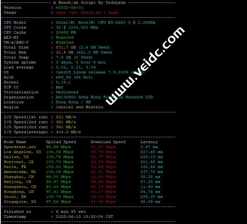 博鳌云的香港110M大带宽独立服务器销售一直都比较火爆,用户体验反馈也不错,价格也比较实惠,比如入门级配置:E3/8G内存/240G/500G SSD或1T HDD,现在特价月付799元,且可付5个月用6个月,付10个月用13个月,免费上机测试,满意在付款,PS:需先注册账号下订单,无需付款,即可联系客服或是提交工单安排上机测试。本次我们主要测评一下香港110M大带宽独立服务器的性能、网络、线路走法等,测评机器为Intel Xeon E5-2660 v2*2,32G内存,1TBSSD硬盘,下面请看具体测评内容。