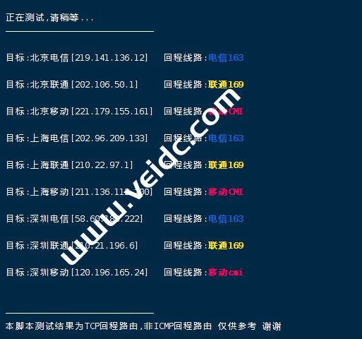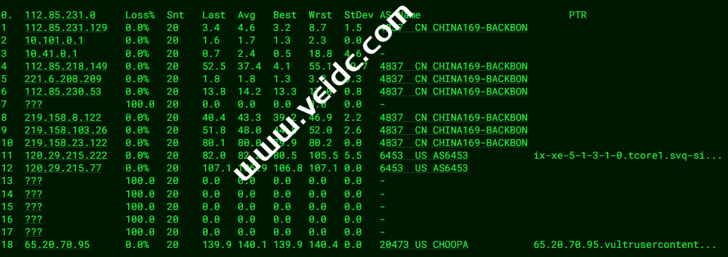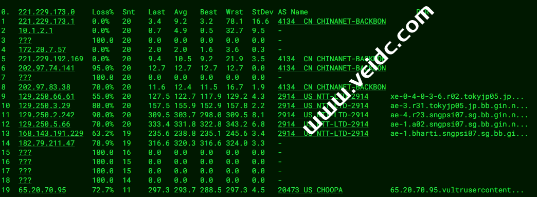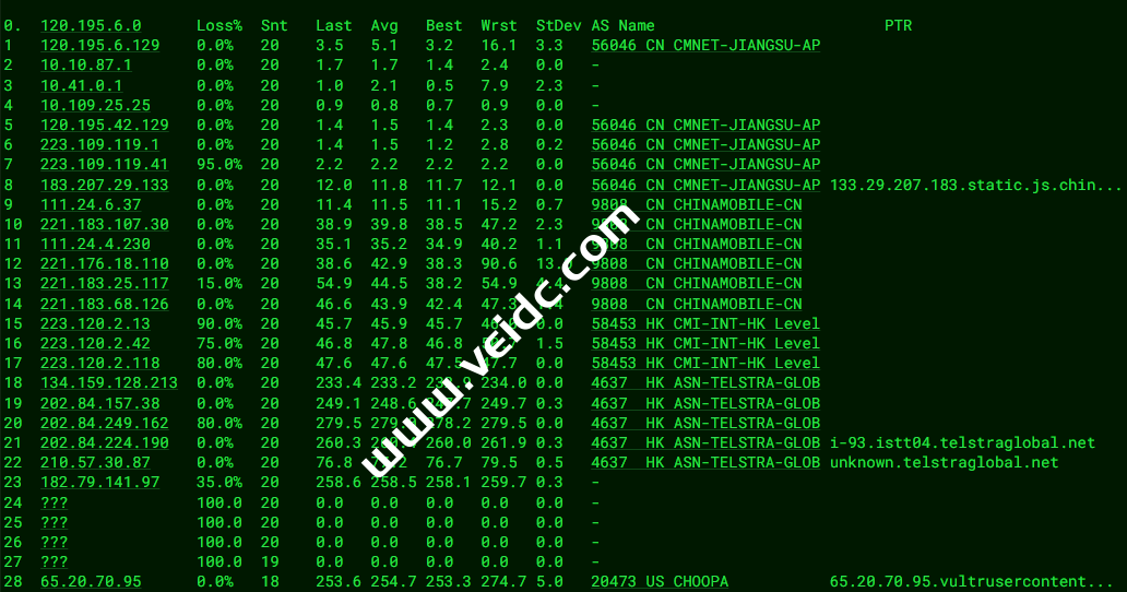 [Info] 测试路由 到 上海电信(天翼云) 中 ... traceroute to 101.227.255.45 (101.227.255.45), 30 hops max, 32 byte packets 1 * 2 100.100.200.1 0.73 ms * Shared Address 3 10.90.0.141 1.42 ms * LAN Address 4 * 5 121.241.56.169 1.36 ms AS4755 India, Maharashtra, tatacommunications.com 6 172.23.78.237 1.40 ms * LAN Address 7 ix-ae-0-100.tcore1.mlv-mumbai.as6453.net (180.87.38.5) 1.94 ms AS6453 India, Maharashtra, Mumbai, tatacommunications.com 8 if-ae-2-2.tcore2.mlv-mumbai.as6453.net (180.87.38.2) 125.19 ms AS6453 India, Maharashtra, Mumbai, tatacommunications.com 9 * 10 * 11 if-ae-35-2.thar1.lrt-london.as6453.net (80.231.130.47) 125.58 ms AS6453 United Kingdom, London, tatacommunications.com 12 118.85.205.29 122.18 ms AS4134 United Kingdom, London, ChinaTelecom 13 * 14 202.97.12.209 241.69 ms AS4134 China, Shanghai, ChinaTelecom 15 * 16 61.152.25.37 246.57 ms AS4812 China, Shanghai, ChinaTelecom 17 124.74.166.222 245.87 ms AS4812 China, Shanghai, ChinaTelecom 18 * 19 * 20 * 21 * 22 * 23 * 24 * 25 * 26 * 27 * 28 * 29 * 30 * [Info] 测试路由 到 上海电信(天翼云) 完成 ! [Info] 测试路由 到 厦门电信CN2 中 ... traceroute to 117.28.254.129 (117.28.254.129), 30 hops max, 32 byte packets 1 * 2 100.100.100.1 0.69 ms * Shared Address 3 10.90.0.129 3.50 ms * LAN Address 4 * 5 * 6 nsg-static-061.21.72.182.airtel.in (182.72.21.61) 1.05 ms AS9498 India, Maharashtra, airtel.com 7 116.119.57.144 50.19 ms AS9498 Singapore, airtel.com 8 203.208.148.89 53.49 ms AS7473 Singapore, singtel.com 9 203.208.178.121 50.80 ms AS7473 Singapore, singtel.com 10 203.208.158.17 52.35 ms AS7473 Singapore, singtel.com 11 203.208.131.50 52.88 ms AS7473 Singapore, singtel.com 12 59.43.182.121 98.90 ms * China, Guangdong, Guangzhou, ChinaTelecom 13 * 14 59.43.130.101 93.35 ms * China, Guangdong, Guangzhou, ChinaTelecom 15 59.43.46.214 109.06 ms * China, Fujian, ChinaTelecom 16 110.80.128.94 141.52 ms AS133775 China, Fujian, Xiamen, ChinaTelecom 17 27.159.81.214 157.38 ms AS133775 China, Fujian, Xiamen, ChinaTelecom 18 117.25.141.106 143.07 ms AS133775 China, Fujian, Xiamen, ChinaTelecom 19 117.28.254.129 110.75 ms AS4809 China, Fujian, Xiamen, ChinaTelecom [Info] 测试路由 到 厦门电信CN2 完成 ! [Info] 测试路由 到 浙江杭州联通 中 ... traceroute to 101.71.241.238 (101.71.241.238), 30 hops max, 32 byte packets 1 * 2 100.100.200.1 0.62 ms * Shared Address 3 10.90.0.141 1.41 ms * LAN Address 4 * 5 121.241.56.169 1.36 ms AS4755 India, Maharashtra, tatacommunications.com 6 172.31.244.45 45.19 ms * LAN Address 7 ix-ae-20-632.tcore1.svq-singapore.as6453.net (120.29.215.76) 62.64 ms AS6453 Singapore, tatacommunications.com 8 219.158.24.245 91.55 ms AS4837 China, ChinaUnicom 9 219.158.100.29 97.96 ms AS4837 China, Guangdong, Guangzhou, ChinaUnicom 10 219.158.96.206 107.21 ms AS4837 China, Guangdong, Guangzhou, ChinaUnicom 11 219.158.103.217 117.06 ms AS4837 China, Guangdong, Guangzhou, ChinaUnicom 12 219.158.106.70 127.33 ms AS4837 China, Zhejiang, Hangzhou, ChinaUnicom 13 * 14 * 15 * 16 * 17 * 18 * 19 * 20 * 21 * 22 * 23 * 24 * 25 * 26 * 27 * 28 * 29 * 30 * [Info] 测试路由 到 浙江杭州联通 完成 ! [Info] 测试路由 到 浙江杭州移动 中 ... traceroute to 112.17.0.106 (112.17.0.106), 30 hops max, 32 byte packets 1 * 2 100.100.200.1 0.49 ms * Shared Address 3 10.90.0.137 1.42 ms * LAN Address 4 * 5 nsg-static-061.21.72.182.airtel.in (182.72.21.61) 1.40 ms AS9498 India, Maharashtra, airtel.com 6 116.119.68.58 119.34 ms AS9498 United Kingdom, London, airtel.com 7 ldn-b3-link.telia.net (62.115.187.116) 248.25 ms AS1299 United Kingdom, London, telia.com 8 * 9 slou-b1-link.ip.twelve99.net (62.115.117.123) 242.28 ms AS1299 United Kingdom, Berkshire County, Slough, telia.com 10 chinamobile-ic342125-slou-b1.ip.twelve99-cust.net (62.115.171.223) 207.99 ms AS1299 United Kingdom, Berkshire County, Slough, telia.com 11 223.120.10.197 195.62 ms AS58453 United Kingdom, London, ChinaMobile 12 223.120.15.38 237.51 ms AS58453 China, Shanghai, ChinaMobile 13 221.183.55.30 243.30 ms AS9808 China, Shanghai, ChinaMobile 14 221.183.25.189 259.99 ms AS9808 China, Shanghai, ChinaMobile 15 221.176.22.9 241.90 ms AS9808 China, Shanghai, ChinaMobile 16 111.24.17.65 239.00 ms AS9808 China, Shanghai, ChinaMobile 17 221.183.108.122 238.63 ms AS9808 China, Zhejiang, Hangzhou, ChinaMobile 18 * 19 * 20 * 21 * 22 * 23 * 24 * 25 * 26 * 27 * 28 * 29 * 30 * [Info] 测试路由 到 浙江杭州移动 完成 ! [Info] 测试路由 到 北京教育网 中 ... traceroute to 202.205.6.30 (202.205.6.30), 30 hops max, 32 byte packets 1 * 2 100.100.200.1 0.66 ms * Shared Address 3 10.90.0.141 1.58 ms * LAN Address 4 * 5 121.241.56.169 1.52 ms AS4755 India, Maharashtra, tatacommunications.com 6 172.31.244.45 21.90 ms * LAN Address 7 ix-ae-4-2.tcore2.cxr-chennai.as6453.net (180.87.37.1) 20.26 ms AS6453 India, Tamil Nadu, Chennai, tatacommunications.com 8 * 9 if-ae-28-2.tcore1.av3-toyohashi.as6453.net (180.87.3.128) 222.54 ms AS6453 Japan, Aichi, Toyohashi, tatacommunications.com 10 if-ae-2-2.tcore2.av3-toyohashi.as6453.net (180.87.3.131) 229.83 ms AS6453 Japan, Aichi, Toyohashi, tatacommunications.com 11 * 12 if-ae-2-2.tcore1.lvw-losangeles.as6453.net (66.110.59.1) 226.80 ms AS6453 United States, California, Los Angeles, tatacommunications.com 13 66.110.59.182 230.43 ms AS6453 United States, California, Los Angeles, tatacommunications.com 14 101.4.117.213 247.54 ms AS4538 China, Beijing, CHINAEDU 15 * 16 101.4.118.213 246.79 ms AS4538 China, Beijing, CHINAEDU 17 101.4.113.110 246.95 ms AS4538 China, Beijing, CHINAEDU 18 219.224.102.230 243.87 ms AS4538 China, Beijing, CHINAEDU 19 * 20 * 21 * 22 * 23 101.4.130.54 243.91 ms AS4538 China, Beijing, CHINAEDU 24 * 25 * 26 * 27 * 28 * 29 * 30 * [Info] 测试路由 到 北京教育网 完成 ! [Info] 四网路由快速测试 已完成 !