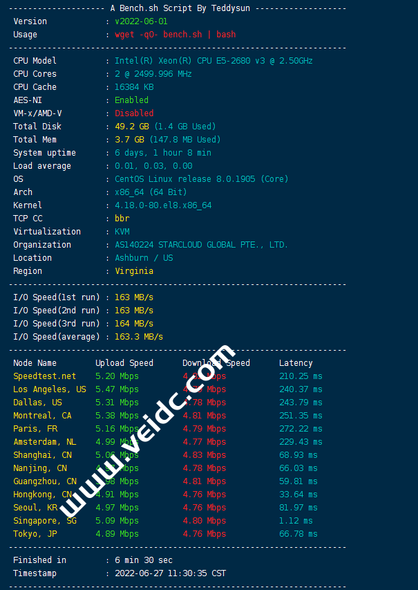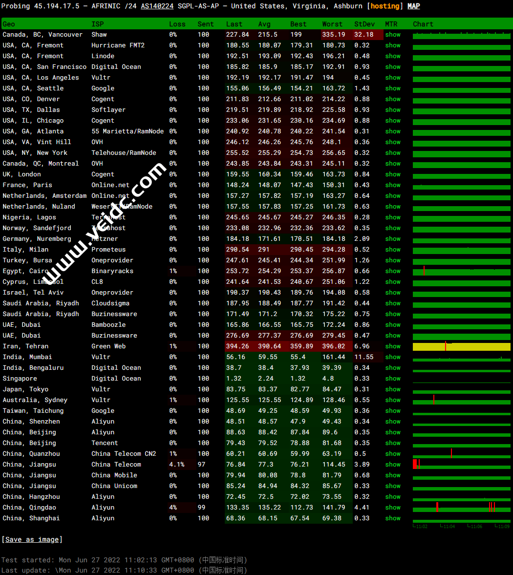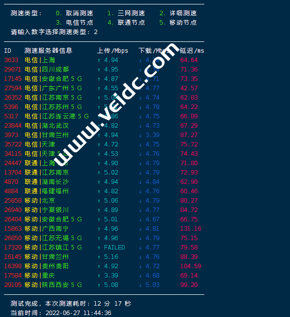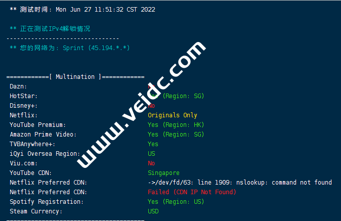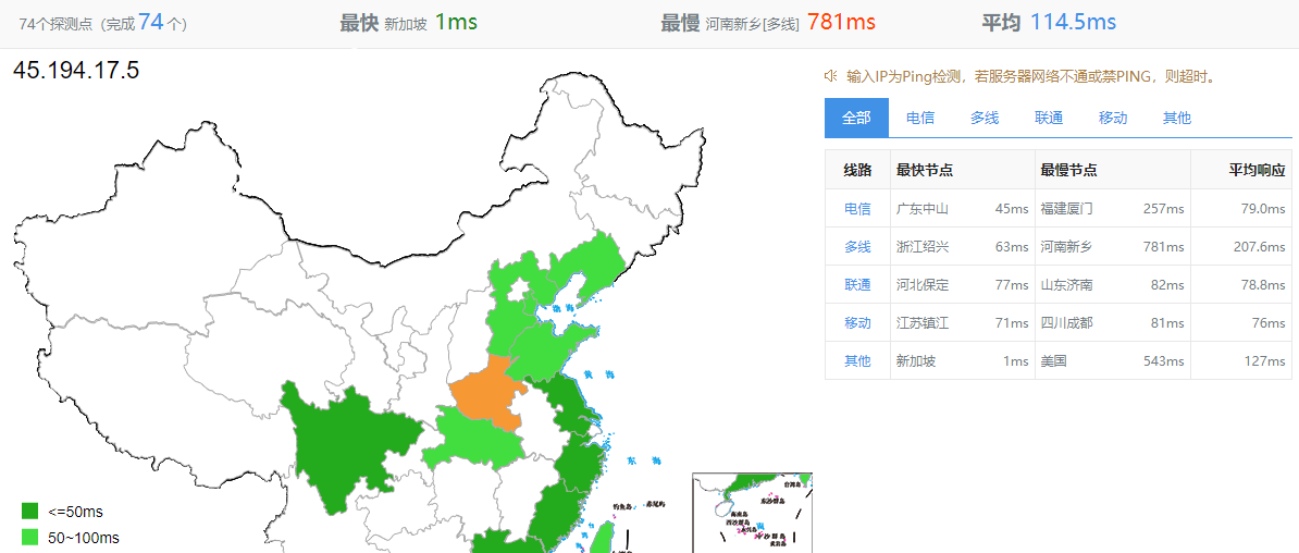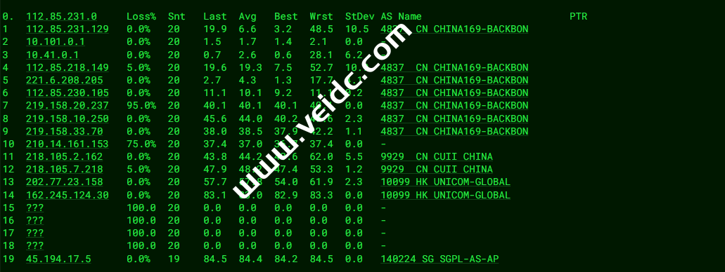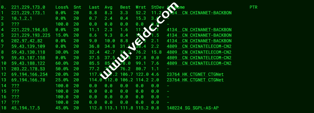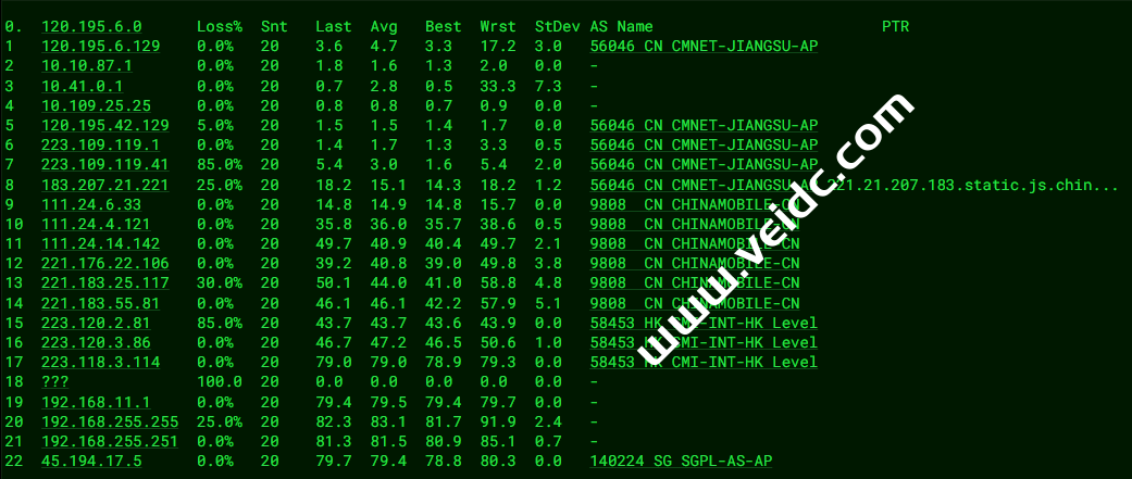 [Info] 测试路由 到 上海电信(天翼云) 中 ... traceroute to 101.227.255.45 (101.227.255.45), 30 hops max, 32 byte packets 1 45.194.17.254 16.37 ms AS140224 新加坡, cloudinnovation.org 2 192.168.255.250 11.35 ms * 局域网 3 192.168.255.254 0.44 ms * 局域网 4 121.59.124.25 0.83 ms AS23764 新加坡, chinatelecom.com.cn, 电信 5 69.194.166.77 1.32 ms AS23764 新加坡, chinatelecom.com.cn, 电信 6 69.194.186.1 35.32 ms * 美国, 路易斯安那州, conterra.com 7 203.22.178.18 36.70 ms * 中国, 香港, chinatelecom.com.cn, 电信 8 59.43.248.109 62.29 ms * 中国, 上海, chinatelecom.com.cn, 电信 9 * 10 59.43.138.49 62.88 ms * 中国, 上海, chinatelecom.com.cn, 电信 11 61.152.24.194 67.21 ms AS4812 中国, 上海, chinatelecom.com.cn, 电信 12 * 13 * 14 * 15 * 16 * 17 * 18 * 19 * 20 * 21 * 22 * 23 * 24 * 25 * 26 * 27 * 28 * 29 * 30 * [Info] 测试路由 到 上海电信(天翼云) 完成 ! [Info] 测试路由 到 厦门电信CN2 中 ... traceroute to 117.28.254.129 (117.28.254.129), 30 hops max, 32 byte packets 1 45.194.17.254 10.72 ms AS140224 新加坡, cloudinnovation.org 2 * 3 192.168.255.254 0.59 ms * 局域网 4 121.59.124.25 1.13 ms AS23764 新加坡, chinatelecom.com.cn, 电信 5 69.194.166.17 0.63 ms AS23764 新加坡, chinatelecom.com.cn, 电信 6 69.194.186.85 34.26 ms * 美国, 路易斯安那州, conterra.com 7 203.22.178.26 36.55 ms * 中国, 香港, chinatelecom.com.cn, 电信 8 59.43.183.109 40.81 ms * 中国, 广东, 广州, chinatelecom.com.cn, 电信 9 59.43.187.113 41.64 ms * 中国, 广东, 广州, chinatelecom.com.cn, 电信 10 59.43.130.149 43.36 ms * 中国, 广东, 广州, chinatelecom.com.cn, 电信 11 59.43.140.34 56.34 ms * 中国, 福建, chinatelecom.com.cn, 电信 12 * 13 27.159.81.210 78.85 ms AS133775 中国, 福建, 厦门, chinatelecom.com.cn, 电信 14 117.25.141.110 69.55 ms AS133775 中国, 福建, 厦门, chinatelecom.com.cn, 电信 15 117.28.254.129 61.05 ms AS4809 中国, 福建, 厦门, chinatelecom.com.cn, 电信 [Info] 测试路由 到 厦门电信CN2 完成 ! [Info] 测试路由 到 浙江杭州联通 中 ... traceroute to 101.71.241.238 (101.71.241.238), 30 hops max, 32 byte packets 1 45.194.17.254 6.50 ms AS140224 新加坡, cloudinnovation.org 2 192.168.255.250 12.17 ms * 局域网 3 192.168.255.254 0.63 ms * 局域网 4 43.252.87.217 0.86 ms AS10099 中国, 香港, chinaunicom.com, 联通 5 61.14.201.109 34.56 ms * 中国, 香港, chinaunicom.com, 联通 6 202.77.23.157 34.19 ms AS10099 中国, 香港, chinaunicom.com, 联通 7 218.105.10.129 42.58 ms AS9929 中国, 广东, 广州, chinaunicom.com, 联通 8 218.105.2.133 38.54 ms AS9929 中国, 广东, 广州, chinaunicom.com, 联通 9 218.105.131.198 67.52 ms AS9929 中国, 上海, chinaunicom.com, 联通 10 218.105.2.174 66.83 ms AS9929 中国, 上海, chinaunicom.com, 联通 11 219.158.44.209 69.05 ms AS4837 中国, 上海, chinaunicom.com, 联通 12 219.158.113.197 73.67 ms AS4837 中国, 上海, chinaunicom.com, 联通 13 219.158.106.122 75.75 ms AS4837 中国, 浙江, 杭州, chinaunicom.com, 联通 14 * 15 * 16 * 17 * 18 * 19 * 20 * 21 * 22 * 23 * 24 * 25 * 26 * 27 * 28 * 29 * 30 * [Info] 测试路由 到 浙江杭州联通 完成 ! [Info] 测试路由 到 浙江杭州移动 中 ... traceroute to 112.17.0.106 (112.17.0.106), 30 hops max, 32 byte packets 1 45.194.17.254 8.83 ms AS140224 新加坡, cloudinnovation.org 2 * 3 192.168.231.254 0.39 ms * 局域网 4 223.119.21.9 0.99 ms AS58453 新加坡, chinamobile.com, 移动 5 223.118.3.33 38.02 ms AS58453 中国, 香港, chinamobile.com, 移动 6 221.183.30.137 39.46 ms AS9808 中国, 广东, 广州, chinamobile.com, 移动 7 221.176.24.57 40.98 ms AS9808 中国, 广东, 广州, chinamobile.com, 移动 8 221.176.22.233 41.72 ms AS9808 中国, 广东, 广州, chinamobile.com, 移动 9 111.24.14.145 43.07 ms AS9808 中国, 广东, 广州, chinamobile.com, 移动 10 111.24.4.170 86.38 ms AS9808 中国, 浙江, 杭州, chinamobile.com, 移动 11 * 12 117.148.185.110 68.57 ms AS56041 中国, 浙江, 杭州, chinamobile.com, 移动 13 * 14 * 15 * 16 * 17 * 18 * 19 * 20 * 21 * 22 * 23 * 24 * 25 * 26 * 27 * 28 * 29 * 30 * [Info] 测试路由 到 浙江杭州移动 完成 ! [Info] 测试路由 到 北京教育网 中 ... traceroute to 202.205.6.30 (202.205.6.30), 30 hops max, 32 byte packets 1 45.194.17.254 8.25 ms AS140224 新加坡, cloudinnovation.org 2 192.168.231.250 37.83 ms * 局域网 3 192.168.231.254 0.65 ms * 局域网 4 58453.sgw.equinix.com (27.111.228.228) 1.13 ms * 新加坡, equinix.com 5 223.120.2.105 36.22 ms AS58453 中国, 香港, chinamobile.com, 移动 6 223.120.3.86 35.92 ms AS58453 中国, 香港, chinamobile.com, 移动 7 223.119.81.94 69.39 ms AS58453 中国, 香港, chinamobile.com, 移动 8 101.4.114.181 76.37 ms AS4538 中国, 北京, edu.cn, 教育网 9 * 10 * 11 101.4.118.213 69.93 ms AS4538 中国, 北京, edu.cn, 教育网 12 101.4.113.110 79.45 ms AS4538 中国, 北京, edu.cn, 教育网 13 219.224.102.230 74.26 ms AS4538 中国, 北京, edu.cn, 教育网 14 * 15 101.4.130.53 70.61 ms AS4538 中国, 北京, edu.cn, 教育网 16 * 17 101.4.130.53 70.43 ms AS4538 中国, 北京, edu.cn, 教育网 18 * 19 * 20 * 21 101.4.130.53 70.81 ms AS4538 中国, 北京, edu.cn, 教育网 22 * 23 * 24 * 25 101.4.130.53 70.71 ms AS4538 中国, 北京, edu.cn, 教育网 26 101.4.130.54 72.06 ms AS4538 中国, 北京, edu.cn, 教育网 27 * 28 * 29 101.4.130.53 70.83 ms AS4538 中国, 北京, edu.cn, 教育网 30 * [Info] 测试路由 到 北京教育网 完成 ! [Info] 四网路由快速测试 已完成 !