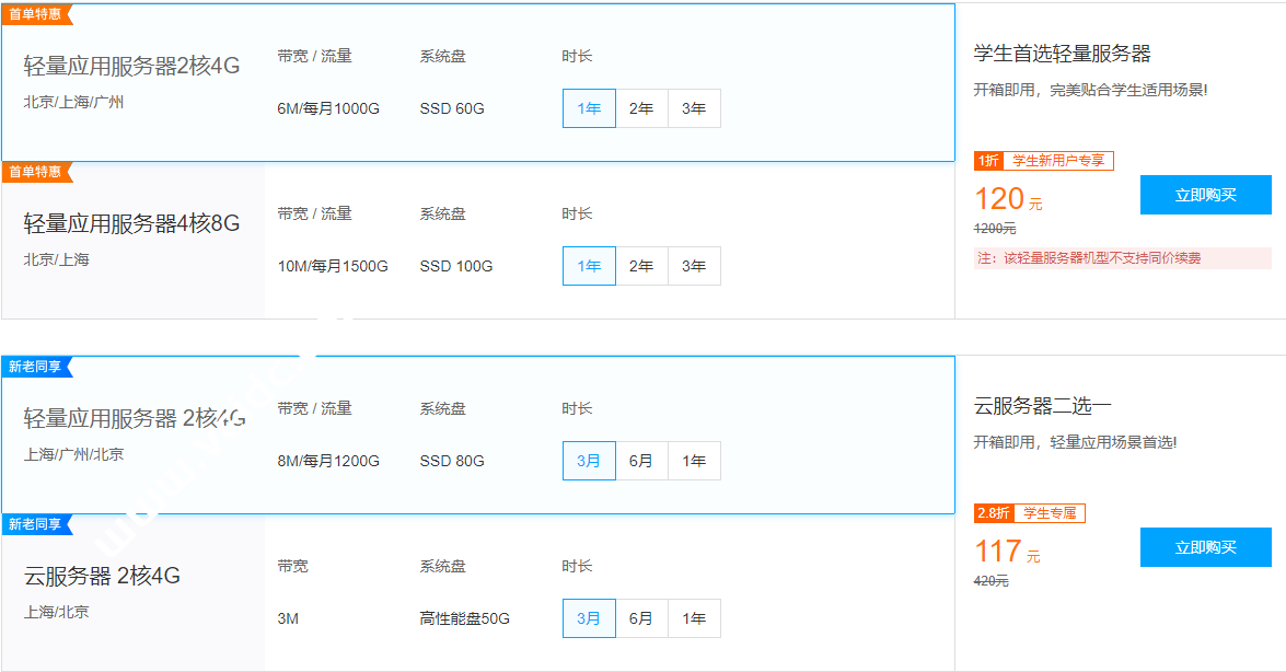 此前参与过云+校园活动并购买旧版1核2G云服务器的用户,待旧版1核2G服务器到期后,才可购买当前新版
