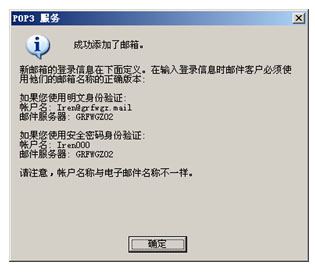(3)在如图所示邮件服务器窗口左边窗格中选择相应的邮件服务器域名,在右边窗格中单击添加邮箱链接。在这里可以添加新用户邮箱。如果要同时为系统创建一个用户帐户,则要选择为此邮箱创建相关联的用户复选项,输入好邮箱名和密码后单击确定按钮,系统会弹出如图所示提示。在提示中提醒了用户在使用不同身份验证方式下的用户邮箱帐户名称。
