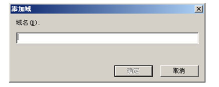 (4) 除了可以向已有域邮件服务器中添加用户邮箱外,还可以在邮件服务器添加多个隶属于不同域系统的邮箱系统。方法是在如图所示邮件服务器窗口中选择邮件服务器,然后在右边的窗格中单击新域链接,打开如图所示对话框。在其中输入新的邮件服务器域名,单击确定按钮即可。这样在一个邮件服务器中就可以为多个不同域系统担当邮件服务器角色。
