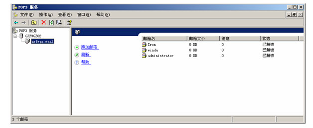 (1)执行【开始】–【管理工具】–【POP3服务】菜单操作,在打开如图所示邮件服务器窗口。
