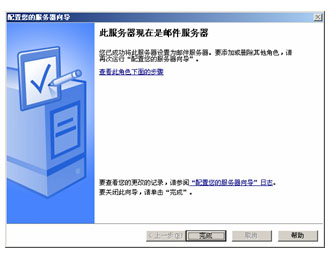 (7) 完成文件复制后系统会自动打开如图49所示向导完成对话框。直接单击完成按钮完成邮件服务器的整个安装过程。完成后执行【开始】–【管理工具】–【管理您的服务器】菜单操作,在打开的如图50所示管理您的服务器窗口即可见到刚才安装的邮件服务器了。单击管理此邮件服务器即可打开邮件服务器窗口,如图所示。