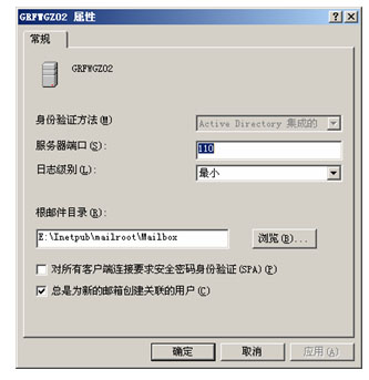 (2)在窗口左边单击邮件服务器名(本示例为grfwgz02),然后单击右键,在弹出菜单中选择属性选项,或者在右边窗格中单击服务器属性链接,都可打开如图54所示邮件服务器属性对话框。