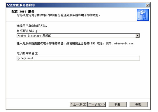 (4)单击下一步按钮,打开如图所示对话框。在其中要求选择邮件服务器中所使用的用户身份验证方法,一般如果是在域网络中,选择Active Directory集成的这种方式,这样邮件服务器就会以用户的域帐户进行身份认证。然后在电子邮件域名中指定一个邮件服务器名,本示例为grfwgz.mail。