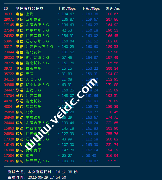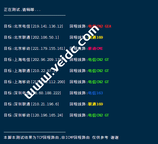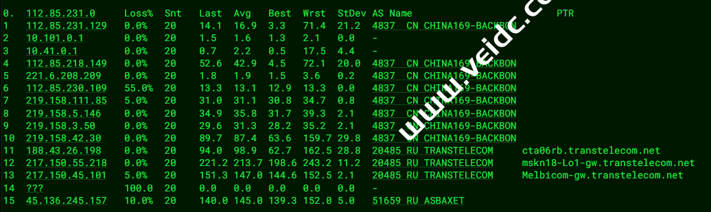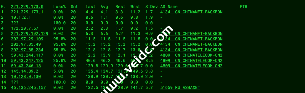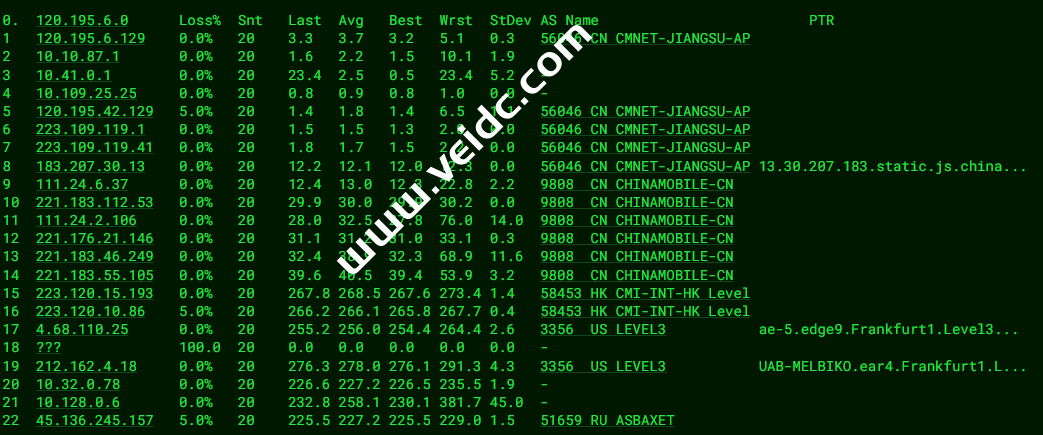 [Info] 测试路由 到 上海电信(天翼云) 中 ... traceroute to 101.227.255.45 (101.227.255.45), 30 hops max, 32 byte packets 1 45.136.244.1 18.72 ms AS51659 俄罗斯, 莫斯科, domainshop.ru 2 * 3 10.32.0.93 37.20 ms * 局域网 4 ancotel.GM-FF-FRK-F-2.163.chinatelecomeurope.com (80.81.195.33) 180.87 ms * 德国, 黑森州, 法兰克福, de-cix.net 5 * 6 * 7 * 8 61.152.25.17 187.74 ms AS4812 中国, 上海, chinatelecom.com.cn, 电信 9 124.74.166.130 185.37 ms AS4812 中国, 上海, chinatelecom.com.cn, 电信 10 * 11 * 12 * 13 * 14 * 15 * 16 * 17 * 18 * 19 * 20 * 21 * 22 * 23 * 24 * 25 * 26 * 27 * 28 * 29 * 30 * [Info] 测试路由 到 上海电信(天翼云) 完成 ! [Info] 测试路由 到 厦门电信CN2 中 ... traceroute to 117.28.254.129 (117.28.254.129), 30 hops max, 32 byte packets 1 45.136.244.1 8.27 ms AS51659 俄罗斯, 莫斯科, domainshop.ru 2 * 3 * 4 145.14.89.1 1.31 ms * 俄罗斯, 莫斯科, cteurope.net 5 59.43.246.17 89.14 ms * 中国, 北京, chinatelecom.com.cn, 电信 6 * 7 59.43.132.13 90.87 ms * 中国, 北京, chinatelecom.com.cn, 电信 8 59.43.142.234 124.43 ms * 中国, 广东, 广州, chinatelecom.com.cn, 电信 9 59.43.46.214 138.00 ms * 中国, 福建, chinatelecom.com.cn, 电信 10 * 11 * 12 117.25.141.106 142.08 ms AS133775 中国, 福建, 厦门, chinatelecom.com.cn, 电信 13 117.28.254.129 139.52 ms AS4809 中国, 福建, 厦门, chinatelecom.com.cn, 电信 [Info] 测试路由 到 厦门电信CN2 完成 ! [Info] 测试路由 到 浙江杭州联通 中 ... traceroute to 101.71.241.238 (101.71.241.238), 30 hops max, 32 byte packets 1 45.136.244.1 40.94 ms AS51659 俄罗斯, 莫斯科, domainshop.ru 2 * 3 10.32.0.93 37.14 ms * 局域网 4 ae8.cr4-fra6.ip4.gtt.net (92.60.249.225) 37.64 ms AS3257 德国, 黑森州, 法兰克福, gtt.net 5 ae22.cr2-fra6.ip4.gtt.net (213.200.117.138) 55.83 ms AS3257 德国, 黑森州, 法兰克福, gtt.net 6 219.158.43.189 197.15 ms AS4837 中国, chinaunicom.com, 联通 7 219.158.20.177 181.11 ms AS4837 中国, 广东, 广州, chinaunicom.com, 联通 8 219.158.103.37 179.90 ms AS4837 中国, 广东, 广州, chinaunicom.com, 联通 9 219.158.8.117 180.62 ms AS4837 中国, 广东, 广州, chinaunicom.com, 联通 10 219.158.20.234 187.90 ms AS4837 中国, 浙江, 杭州, chinaunicom.com, 联通 11 101.71.244.38 192.88 ms AS4837 中国, 浙江, 杭州, chinaunicom.com, 联通 12 * 13 * 14 * 15 * 16 * 17 * 18 * 19 * 20 * 21 * 22 * 23 * 24 * 25 * 26 * 27 * 28 * 29 * 30 * [Info] 测试路由 到 浙江杭州联通 完成 ! [Info] 测试路由 到 浙江杭州移动 中 ... traceroute to 112.17.0.106 (112.17.0.106), 30 hops max, 32 byte packets 1 45.136.244.1 84.90 ms AS51659 俄罗斯, 莫斯科, domainshop.ru 2 * 3 10.32.0.93 36.98 ms * 局域网 4 9-1-4.ear4.Frankfurt1.Level3.net (212.162.4.17) 36.93 ms AS3356 德国, 黑森州, 法兰克福, level3.com 5 ae2.3222.edge9.Frankfurt1.level3.net (4.69.167.118) 37.26 ms AS3356 德国, 黑森州, 法兰克福, level3.com 6 4.68.110.26 37.70 ms AS3356 德国, 黑森州, 法兰克福, level3.com 7 223.120.10.85 37.53 ms AS58453 德国, 黑森州, 法兰克福, chinamobile.com, 移动 8 223.120.15.206 254.09 ms AS58453 中国, 广东, 广州, chinamobile.com, 移动 9 221.183.55.46 275.86 ms AS9808 中国, 上海, chinamobile.com, 移动 10 221.183.25.189 255.52 ms AS9808 中国, 上海, chinamobile.com, 移动 11 221.176.22.29 276.76 ms AS9808 中国, 上海, chinamobile.com, 移动 12 111.24.4.81 264.60 ms AS9808 中国, 上海, chinamobile.com, 移动 13 111.24.3.30 298.85 ms AS9808 中国, 浙江, 杭州, chinamobile.com, 移动 14 * 15 112.17.253.114 242.88 ms AS56041 中国, 浙江, 杭州, chinamobile.com, 移动 16 * 17 * 18 * 19 * 20 * 21 * 22 * 23 * 24 * 25 * 26 * 27 * 28 * 29 * 30 * [Info] 测试路由 到 浙江杭州移动 完成 ! [Info] 测试路由 到 北京教育网 中 ... traceroute to 202.205.6.30 (202.205.6.30), 30 hops max, 32 byte packets 1 45.136.244.1 101.91 ms AS51659 俄罗斯, 莫斯科, domainshop.ru 2 * 3 * 4 145.14.89.1 1.36 ms * 俄罗斯, 莫斯科, cteurope.net 5 59.43.246.17 89.18 ms * 中国, 北京, chinatelecom.com.cn, 电信 6 59.43.247.126 119.97 ms * 中国, 上海, chinatelecom.com.cn, 电信 7 59.43.244.118 117.63 ms * 中国, 上海, chinatelecom.com.cn, 电信 8 * 9 * 10 202.97.62.78 179.54 ms AS4134 中国, 上海, chinatelecom.com.cn, 电信 11 202.97.19.14 195.67 ms AS4134 中国, 上海, chinatelecom.com.cn, 电信 12 101.4.118.197 197.62 ms AS4538 中国, 北京, edu.cn, 教育网 13 101.4.113.110 211.70 ms AS4538 中国, 北京, edu.cn, 教育网 14 * 15 101.4.130.54 198.55 ms AS4538 中国, 北京, edu.cn, 教育网 16 * 17 * 18 * 19 * 20 * 21 * 22 * 23 * 24 * 25 * 26 101.4.130.53 195.61 ms AS4538 中国, 北京, edu.cn, 教育网 27 * 28 * 29 * 30 * [Info] 测试路由 到 北京教育网 完成 ! [Info] 四网路由快速测试 已完成 !