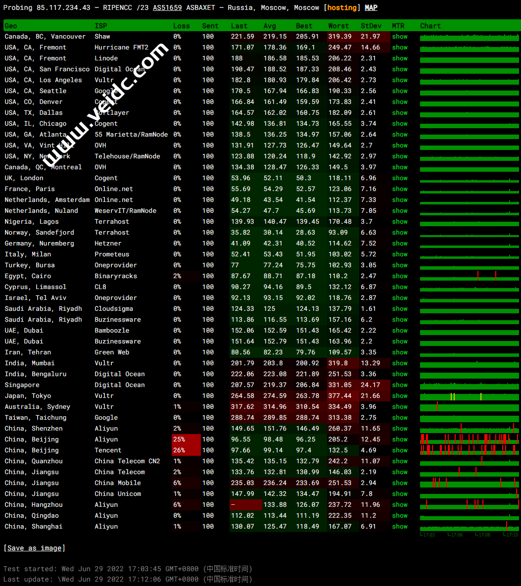 全球PING及丢包率测试: