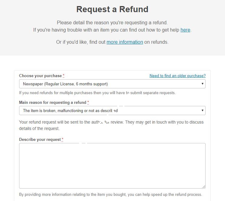 - 自己的描述,这个区域其实是我们主要填写的,因为数字产品不像实物,Themeforest的退款政策是很严格的,充分填写自己的理由,比如主题有质量问题,就详细说明主题错误以及给自己带来的不便。总之,越详细退款的成功率就会高一些