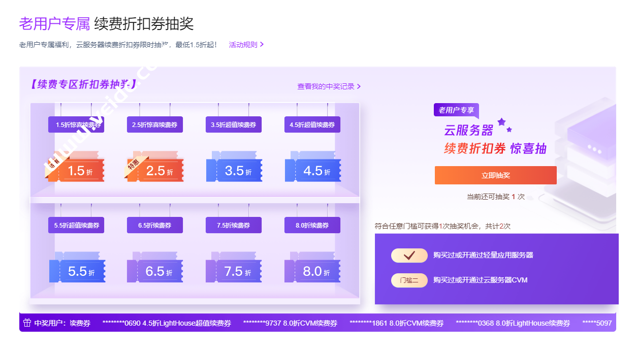 门槛二:如果用户购买过或开通过云服务器 CVM 则拥有1次抽奖机会,可中奖奖品为云服务器CVM的续费折扣券;