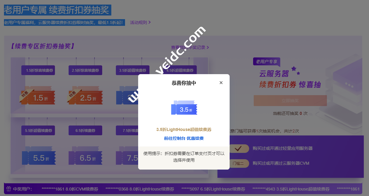 4、奖品发放时间:续费折扣券中奖后5分钟内自动发放至账户,可在控制台-折扣券处查看;(抽奖结果默认与符合门槛的先后顺序依次对应;若同时符合门槛一和门槛二,第1次抽奖结果对应门槛一,可中奖奖品为轻量应用服务器LightHouse的续费折扣券;第2次抽奖结果对应门槛二,可中奖奖品为云服务器CVM的续费折扣券;)