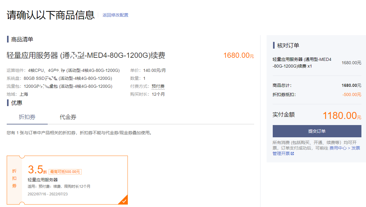 6、续费折扣券仅适用于续费预付费轻量应用服务器和云服务器CVM。云服务器CVM所有折扣的续费折扣券最高可抵扣金额均为1000元;轻量应用服务器所有折扣的续费折扣券最高可抵扣金额均为500元;(如:对于1.5折轻量应用服务器续费折扣券最高抵扣金额为500元;续费原价100元,使用本券可抵扣85元,实付15元;续费原价1000元,使用本券可抵扣500元,实付500元;)
