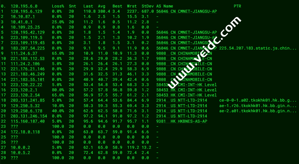 [Info] 测试路由 到 上海电信(天翼云) 中 ... traceroute to 101.227.255.45 (101.227.255.45), 30 hops max, 32 byte packets 1 10.2.210.1 0.24 ms * 局域网 2 * 3 * 4 10.0.8.2 49.64 ms * 局域网 5 192.168.88.97 2.70 ms * 局域网 6 23.225.55.54 4.76 ms AS40065 中国, 香港, ceranetworks.com 7 * 8 223.120.3.178 30.93 ms AS58453 中国, 上海, chinamobile.com, 移动 9 221.183.89.174 31.78 ms AS9808 中国, 上海, chinamobile.com, 移动 10 221.183.89.69 32.68 ms AS9808 中国, 上海, chinamobile.com, 移动 11 221.183.89.50 33.12 ms AS9808 中国, 上海, chinamobile.com, 移动 12 221.183.90.242 33.98 ms AS9808 中国, 上海, chinamobile.com, 移动 13 * 14 202.97.86.181 30.15 ms AS4134 中国, 上海, chinatelecom.com.cn, 电信 15 61.152.24.217 36.22 ms AS4812 中国, 上海, chinatelecom.com.cn, 电信 16 * 17 * 18 * 19 * 20 * 21 * 22 * 23 * 24 * 25 * 26 * 27 * 28 * 29 * 30 * [Info] 测试路由 到 上海电信(天翼云) 完成 ! [Info] 测试路由 到 厦门电信CN2 中 ... traceroute to 117.28.254.129 (117.28.254.129), 30 hops max, 32 byte packets 1 10.2.210.1 0.23 ms * 局域网 2 * 3 * 4 10.0.8.2 1.14 ms * 局域网 5 11.0.0.6 0.79 ms AS749 美国, defense.gov 6 hutchcity11-100g.hkix.net (123.255.91.41) 3.00 ms * 中国, 香港, hkix.net 7 218.188.104.54 4.93 ms AS9304 中国, 香港, hgc.com.hk 8 59.43.250.81 8.45 ms * 中国, 广东, 广州, chinatelecom.com.cn, 电信 9 * 10 59.43.130.121 10.88 ms * 中国, 广东, 广州, chinatelecom.com.cn, 电信 11 59.43.46.214 25.97 ms * 中国, 福建, chinatelecom.com.cn, 电信 12 * 13 * 14 * 15 * 16 117.28.254.129 25.63 ms AS4809 中国, 福建, 厦门, chinatelecom.com.cn, 电信 [Info] 测试路由 到 厦门电信CN2 完成 ! [Info] 测试路由 到 浙江杭州联通 中 ... traceroute to 101.71.241.238 (101.71.241.238), 30 hops max, 32 byte packets 1 10.2.210.1 0.23 ms * 局域网 2 * 3 * 4 10.0.8.2 1.37 ms * 局域网 5 172.24.254.2 4.20 ms * 局域网 6 172.24.254.1 6.19 ms * 局域网 7 172.18.0.109 1.85 ms * 局域网 8 static.reserve.wtt.net.hk (218.253.211.241) 2.60 ms AS9381 中国, 香港, hkbn.net 9 115.160.187.108 2.88 ms AS9381 中国, 香港, hkbn.net 10 219.158.39.117 4.47 ms AS4837 中国, 香港, chinaunicom.com, 联通 11 219.158.97.225 6.86 ms AS4837 中国, 香港, chinaunicom.com, 联通 12 219.158.10.53 9.13 ms AS4837 中国, 广东, 广州, chinaunicom.com, 联通 13 219.158.97.26 10.64 ms AS4837 中国, 广东, 广州, chinaunicom.com, 联通 14 219.158.8.113 20.48 ms AS4837 中国, 广东, 广州, chinaunicom.com, 联通 15 219.158.20.234 44.37 ms AS4837 中国, 浙江, 杭州, chinaunicom.com, 联通 16 101.71.244.94 32.12 ms AS4837 中国, 浙江, 杭州, chinaunicom.com, 联通 17 * 18 * 19 * 20 * 21 * 22 * 23 * 24 * 25 * 26 * 27 * 28 * 29 * 30 * [Info] 测试路由 到 浙江杭州联通 完成 ! [Info] 测试路由 到 浙江杭州移动 中 ... traceroute to 112.17.0.106 (112.17.0.106), 30 hops max, 32 byte packets 1 10.2.210.1 0.25 ms * 局域网 2 * 3 * 4 10.0.8.2 1.20 ms * 局域网 5 192.168.88.97 2.93 ms * 局域网 6 23.225.55.54 4.77 ms AS40065 中国, 香港, ceranetworks.com 7 223.120.2.53 5.25 ms AS58453 中国, 香港, chinamobile.com, 移动 8 223.120.2.10 10.46 ms AS58453 中国, 广东, 广州, chinamobile.com, 移动 9 223.120.22.5 37.59 ms AS58453 中国, 上海, chinamobile.com, 移动 10 221.183.55.34 36.92 ms AS9808 中国, 上海, chinamobile.com, 移动 11 221.183.25.193 37.19 ms AS9808 中国, 上海, chinamobile.com, 移动 12 221.176.22.33 37.83 ms AS9808 中国, 上海, chinamobile.com, 移动 13 111.24.4.81 39.26 ms AS9808 中国, 上海, chinamobile.com, 移动 14 111.24.3.30 52.99 ms AS9808 中国, 浙江, 杭州, chinamobile.com, 移动 15 * 16 112.15.225.54 67.63 ms AS56041 中国, 浙江, 杭州, chinamobile.com, 移动 17 * 18 * 19 * 20 * 21 * 22 * 23 * 24 * 25 * 26 * 27 * 28 * 29 * 30 * [Info] 测试路由 到 浙江杭州移动 完成 ! [Info] 测试路由 到 北京教育网 中 ... traceroute to 202.205.6.30 (202.205.6.30), 30 hops max, 32 byte packets 1 10.2.210.1 0.22 ms * 局域网 2 * 3 * 4 10.0.8.2 1.19 ms * 局域网 5 11.0.0.6 0.58 ms AS749 美国, defense.gov 6 cernetedu1-lacp-10g.hkix.net (123.255.91.118) 2.32 ms * 中国, 香港, hkix.net 7 101.4.114.181 38.00 ms AS4538 中国, 北京, edu.cn, 教育网 8 * 9 * 10 101.4.118.213 38.55 ms AS4538 中国, 北京, edu.cn, 教育网 11 101.4.113.110 37.38 ms AS4538 中国, 北京, edu.cn, 教育网 12 219.224.102.230 38.70 ms AS4538 中国, 北京, edu.cn, 教育网 13 * 14 * 15 * 16 * 17 * 18 * 19 * 20 101.4.130.53 39.36 ms AS4538 中国, 北京, edu.cn, 教育网 21 * 22 101.4.130.53 38.84 ms AS4538 中国, 北京, edu.cn, 教育网 23 * 24 * 25 101.4.130.54 38.96 ms AS4538 中国, 北京, edu.cn, 教育网 26 * 27 * 28 * 29 * 30 * [Info] 测试路由 到 北京教育网 完成 ! [Info] 四网路由快速测试 已完成 !
