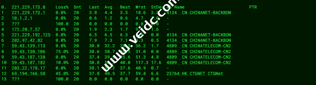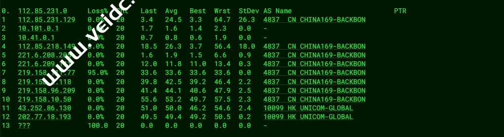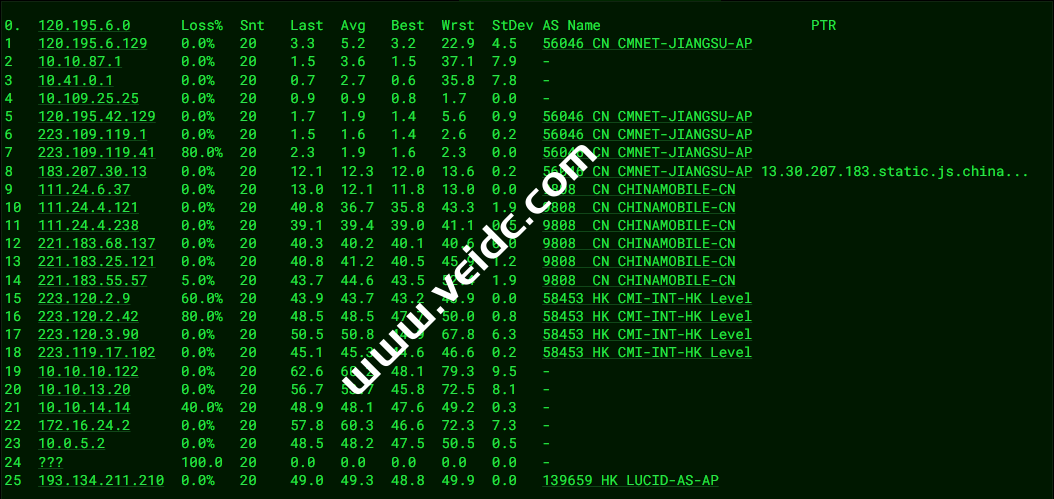 [Info] 测试路由 到 上海电信(天翼云) 中 ... traceroute to 101.227.255.45 (101.227.255.45), 30 hops max, 32 byte packets 1 10.0.237.1 0.36 ms * 局域网 2 * 3 * 4 10.0.8.2 1.26 ms * 局域网 5 192.168.88.97 3.07 ms * 局域网 6 23.225.55.54 2.99 ms AS40065 中国, 香港, ceranetworks.com 7 * 8 223.120.3.174 29.42 ms AS58453 中国, 上海, chinamobile.com, 移动 9 221.183.89.174 30.81 ms AS9808 中国, 上海, chinamobile.com, 移动 10 221.183.89.69 32.84 ms AS9808 中国, 上海, chinamobile.com, 移动 11 221.183.89.50 32.00 ms AS9808 中国, 上海, chinamobile.com, 移动 12 221.183.90.242 38.00 ms AS9808 中国, 上海, chinamobile.com, 移动 13 221.183.123.94 33.22 ms AS9808 中国, 上海, chinamobile.com, 移动 14 * 15 61.152.24.101 37.58 ms AS4812 中国, 上海, chinatelecom.com.cn, 电信 16 * 17 * 18 * 19 * 20 * 21 * 22 * 23 * 24 * 25 * 26 * 27 * 28 * 29 * 30 * [Info] 测试路由 到 上海电信(天翼云) 完成 ! [Info] 测试路由 到 厦门电信CN2 中 ... traceroute to 117.28.254.129 (117.28.254.129), 30 hops max, 32 byte packets 1 10.0.237.1 0.28 ms * 局域网 2 * 3 * 4 10.0.8.2 1.23 ms * 局域网 5 11.0.0.6 0.55 ms AS749 美国, defense.gov 6 hutchcity11-100g.hkix.net (123.255.91.41) 3.00 ms * 中国, 香港, hkix.net 7 218.188.104.218 2.80 ms AS9304 中国, 香港, hgc.com.hk 8 59.43.248.249 8.65 ms * 中国, 广东, 广州, chinatelecom.com.cn, 电信 9 59.43.187.97 8.78 ms * 中国, 广东, 广州, chinatelecom.com.cn, 电信 10 59.43.130.145 9.48 ms * 中国, 广东, 广州, chinatelecom.com.cn, 电信 11 59.43.46.214 24.06 ms * 中国, 福建, chinatelecom.com.cn, 电信 12 * 13 27.148.195.90 46.74 ms AS133775 中国, 福建, 厦门, chinatelecom.com.cn, 电信 14 * 15 * 16 117.28.254.129 28.90 ms AS4809 中国, 福建, 厦门, chinatelecom.com.cn, 电信 [Info] 测试路由 到 厦门电信CN2 完成 ! [Info] 测试路由 到 浙江杭州联通 中 ... traceroute to 101.71.241.238 (101.71.241.238), 30 hops max, 32 byte packets 1 10.0.237.1 0.22 ms * 局域网 2 * 3 * 4 10.0.8.2 1.14 ms * 局域网 5 172.24.254.2 1.45 ms * 局域网 6 172.24.254.1 31.38 ms * 局域网 7 172.18.0.109 1.74 ms * 局域网 8 static.reserve.wtt.net.hk (218.253.211.241) 3.02 ms AS9381 中国, 香港, hkbn.net 9 115.160.187.108 2.67 ms AS9381 中国, 香港, hkbn.net 10 219.158.39.117 3.30 ms AS4837 中国, 香港, chinaunicom.com, 联通 11 219.158.97.233 3.04 ms AS4837 中国, 香港, chinaunicom.com, 联通 12 219.158.20.93 6.48 ms AS4837 中国, 广东, 广州, chinaunicom.com, 联通 13 219.158.103.33 12.90 ms AS4837 中国, 广东, 广州, chinaunicom.com, 联通 14 219.158.103.217 16.88 ms AS4837 中国, 广东, 广州, chinaunicom.com, 联通 15 219.158.114.206 36.03 ms AS4837 中国, 浙江, 杭州, chinaunicom.com, 联通 16 * 17 * 18 * 19 * 20 * 21 * 22 * 23 * 24 * 25 * 26 * 27 * 28 * 29 * 30 * [Info] 测试路由 到 浙江杭州联通 完成 ! [Info] 测试路由 到 浙江杭州移动 中 ... traceroute to 112.17.0.106 (112.17.0.106), 30 hops max, 32 byte packets 1 10.0.237.1 0.24 ms * 局域网 2 * 3 * 4 10.0.8.2 1.79 ms * 局域网 5 192.168.88.97 2.96 ms * 局域网 6 23.225.55.54 3.77 ms AS40065 中国, 香港, ceranetworks.com 7 * 8 223.120.2.2 8.28 ms AS58453 中国, 广东, 广州, chinamobile.com, 移动 9 223.120.22.5 33.86 ms AS58453 中国, 上海, chinamobile.com, 移动 10 221.183.55.26 34.74 ms AS9808 中国, 上海, chinamobile.com, 移动 11 221.176.22.205 33.85 ms AS9808 中国, 上海, chinamobile.com, 移动 12 221.176.22.33 37.61 ms AS9808 中国, 上海, chinamobile.com, 移动 13 111.24.4.77 39.31 ms AS9808 中国, 上海, chinamobile.com, 移动 14 111.24.3.30 50.06 ms AS9808 中国, 浙江, 杭州, chinamobile.com, 移动 15 * 16 112.17.253.114 52.63 ms AS56041 中国, 浙江, 杭州, chinamobile.com, 移动 17 * 18 * 19 * 20 * 21 * 22 * 23 * 24 * 25 * 26 * 27 * 28 * 29 * 30 * [Info] 测试路由 到 浙江杭州移动 完成 ! [Info] 测试路由 到 北京教育网 中 ... traceroute to 202.205.6.30 (202.205.6.30), 30 hops max, 32 byte packets 1 10.0.237.1 0.31 ms * 局域网 2 * 3 * 4 10.0.8.2 1.22 ms * 局域网 5 11.0.0.6 0.57 ms AS749 美国, defense.gov 6 multidata1-10g.hkix.net (123.255.91.118) 41.01 ms * 中国, 香港, hkix.net 7 101.4.114.181 43.47 ms AS4538 中国, 北京, edu.cn, 教育网 8 * 9 * 10 101.4.118.213 44.49 ms AS4538 中国, 北京, edu.cn, 教育网 11 101.4.113.110 42.65 ms AS4538 中国, 北京, edu.cn, 教育网 12 219.224.102.230 41.78 ms AS4538 中国, 北京, edu.cn, 教育网 13 * 14 * 15 * 16 * 17 * 18 * 19 * 20 101.4.130.53 42.68 ms AS4538 中国, 北京, edu.cn, 教育网 21 * 22 * 23 * 24 * 25 * 26 * 27 * 28 * 29 101.4.130.54 43.92 ms AS4538 中国, 北京, edu.cn, 教育网 30 * [Info] 测试路由 到 北京教育网 完成 ! [Info] 四网路由快速测试 已完成 !
